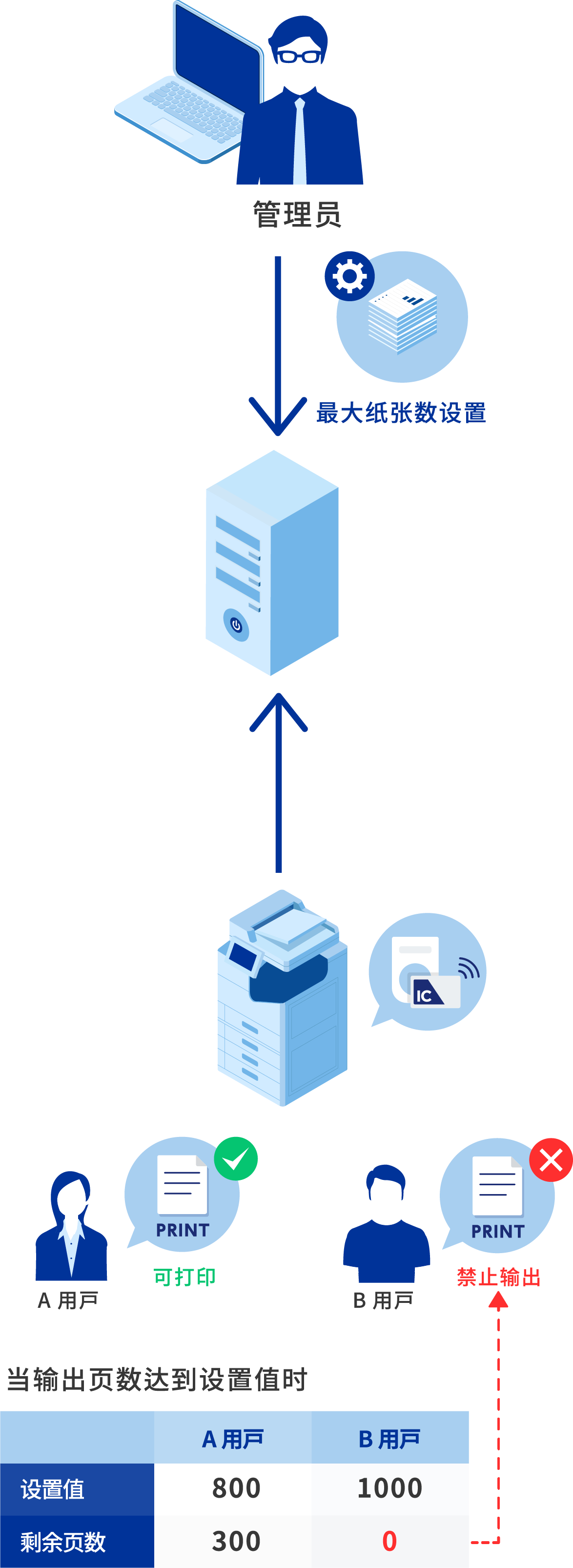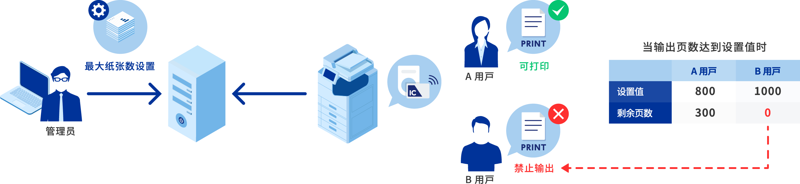 安装“Epson Print Admin”认证打印选项允许您为每个部门和用户设置可打印的页数上限。您可以定义每个月或年的设置,设置彩色和单色打印的页面限制,以及单个功能(打印、复制、内存打印、扫描、发送传真)的限制。另外,“Epson Print Admin”可以输出关于公司多功能打印机的运行状态和性能的报告,让您查看它们对保护环境的贡献。