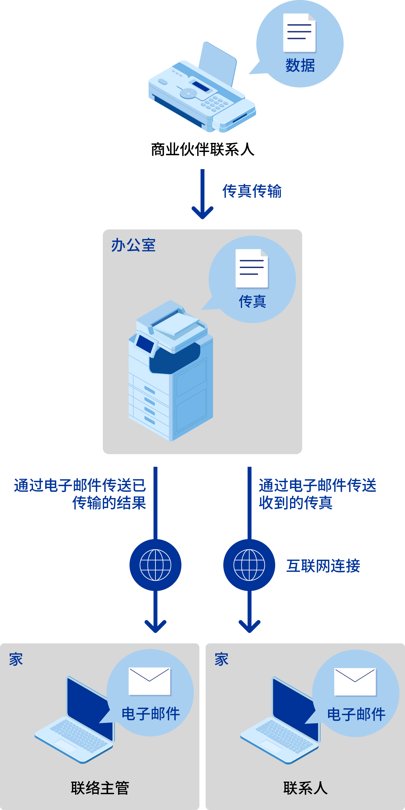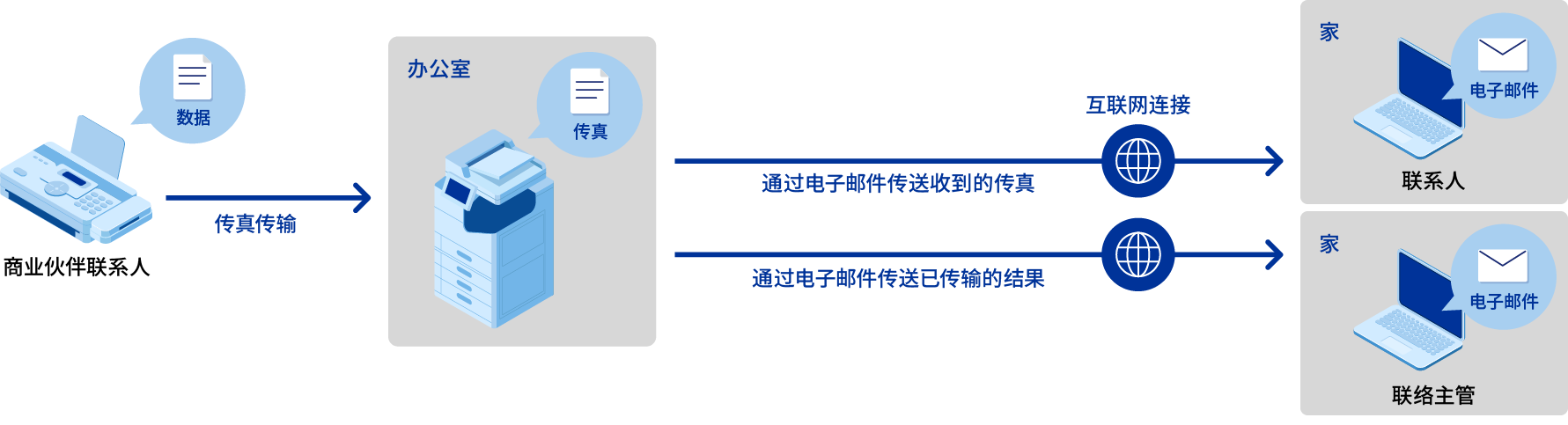 “传真至电子邮件”功能将收到的传真通过电子邮件发送给联系人。这使您在家里工作时也能检查在办公室收到的传真,使工作更有效率。它还提供了一个功能,通过电子邮件通知管理员传输结果,如果出现问题,可以进行跟踪和确认。