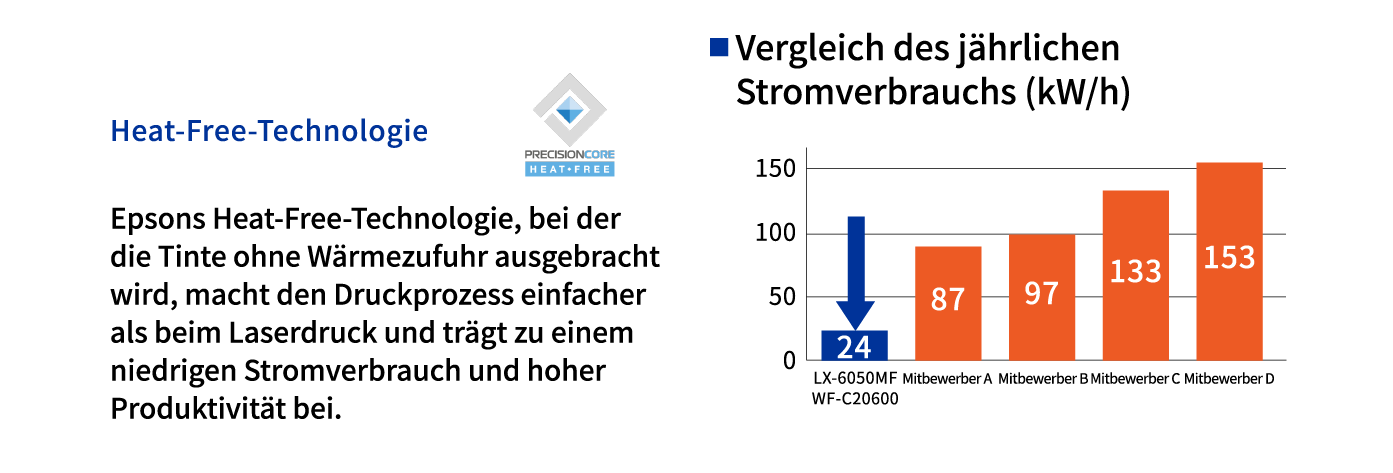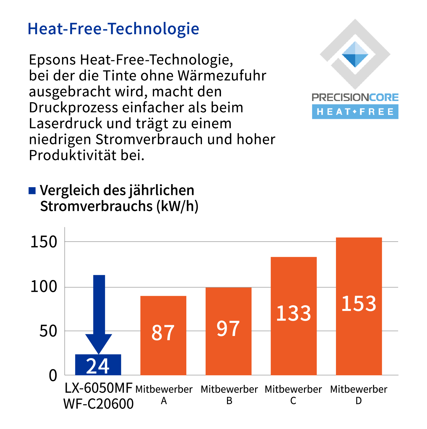 Bei der einzigartigen Tintenstrahltechnologie von Epson wird im Druckprozess keine Wärme eingesetzt, wodurch der Stromverbrauch im Vergleich zu Laserdruckern erheblich gesenkt werden kann.