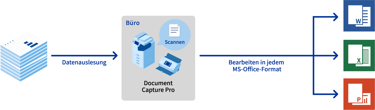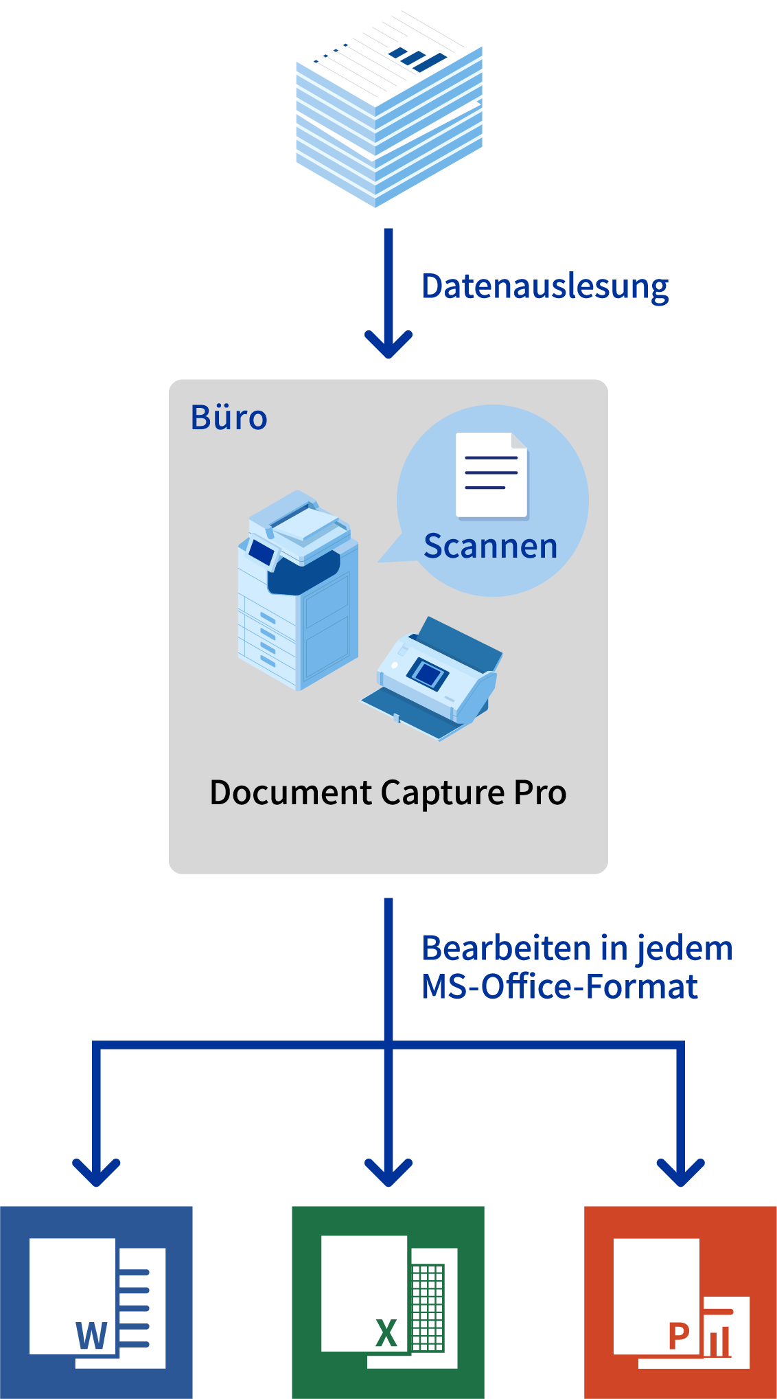 Mit „Document Capture Pro Enhanced OCR“ lassen sich gescannte Daten ganz einfach in eine Vielzahl von Dateien umwandeln, wie z. B. Excel®- und PowerPoint®-Dateien. Gescannte Papierdokumente werden automatisch zu Dateien konvertiert, die Sie weiterverwenden können.