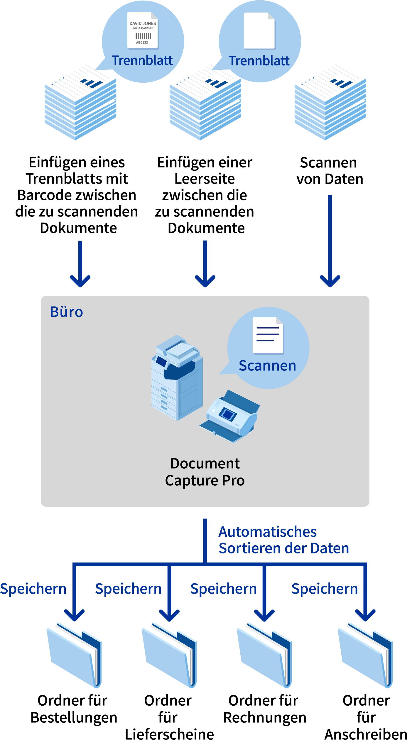 Gescannte Daten können in bestimmten Ordnern gespeichert werden, indem einfach eine leere Seite oder ein Trennblatt mit Barcode-Informationen zwischen die zu scannenden Dokumente eingefügt wird. Diese Daten können dann an E-Mails angehängt oder in einen Cloud-Dienst verschoben werden.