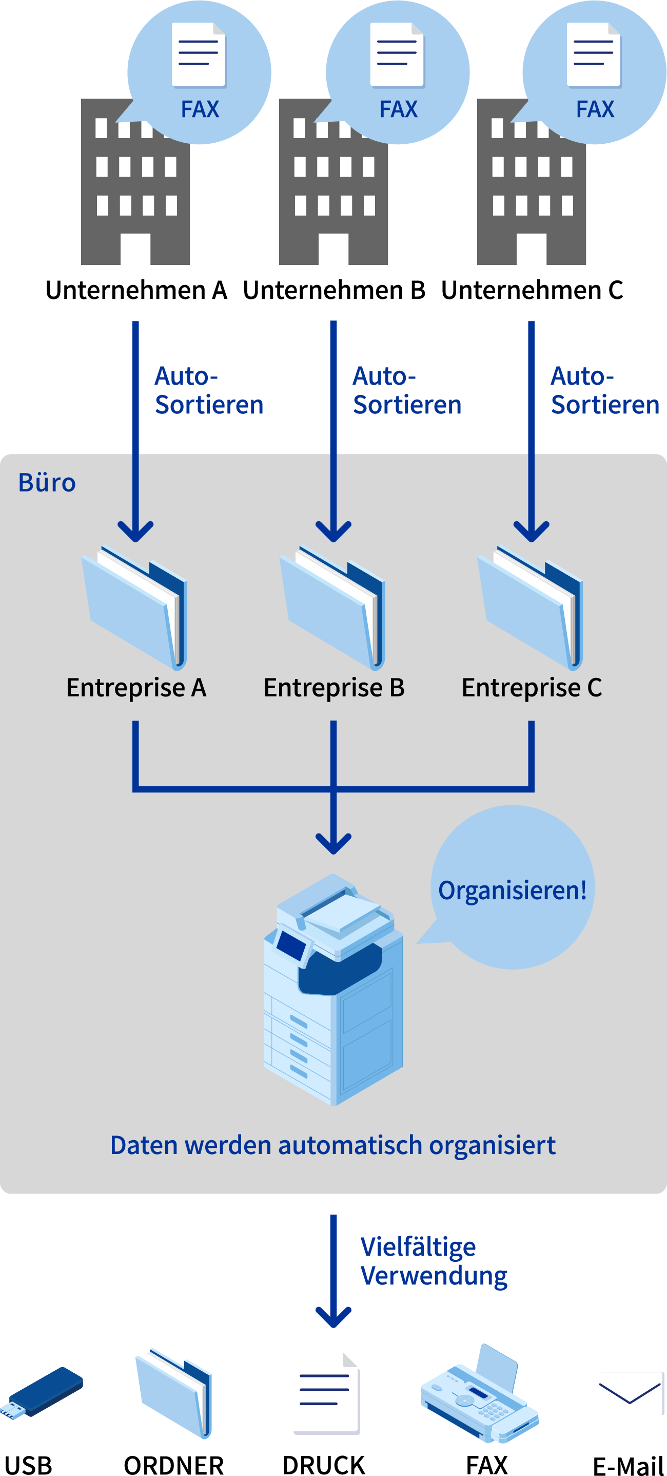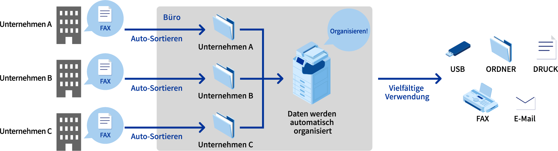 Empfangene Faxdaten können automatisch in der Faxbox auf dem Gerät selbst, in einem bestimmten Ordner, in der Cloud oder auf einem USB-Stick gespeichert oder per E-Mail verschickt werden, abhängig von Faktoren wie Herkunft, Empfangsleitung oder Empfangszeit. Die gespeicherten Daten werden in einer Vorschau angezeigt, so dass der Benutzer das auswählen kann, das er benötigt.