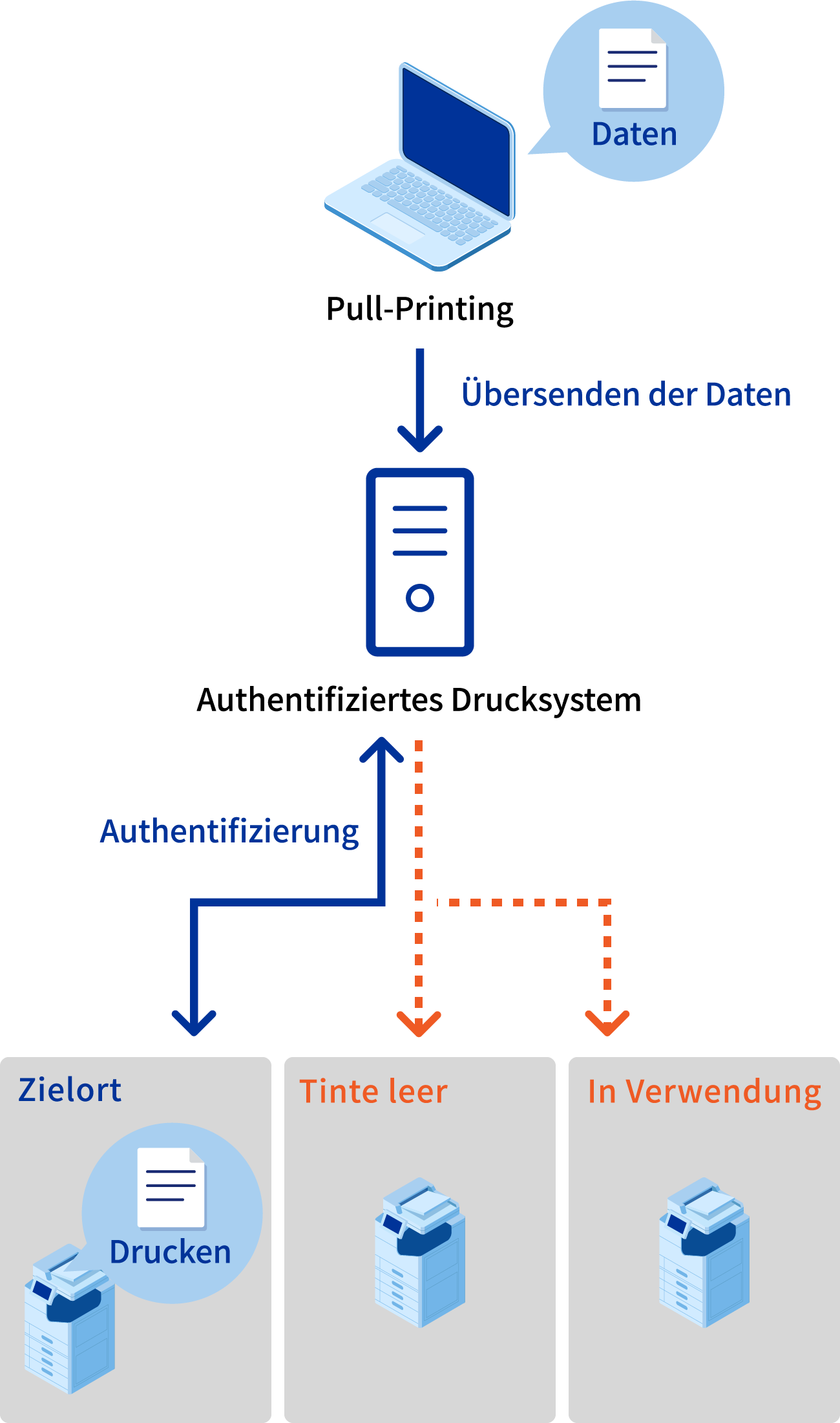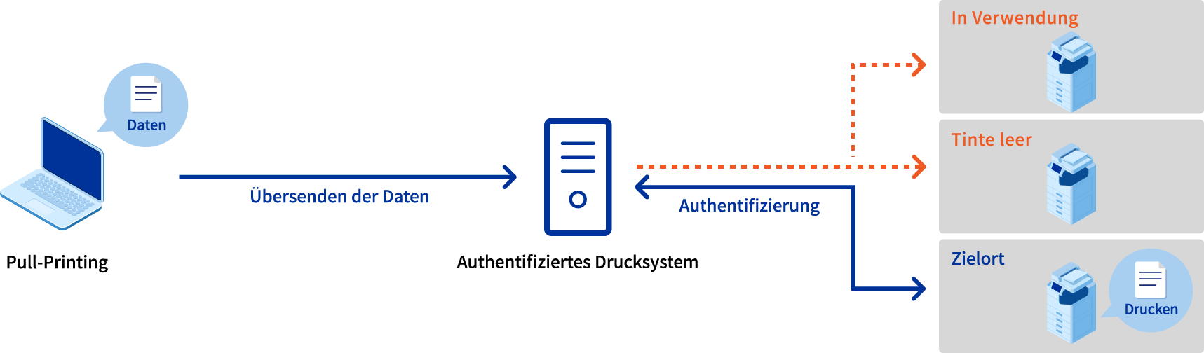 Mit der Funktion „Pull-Printing“ der authentifizierten Druckoption „Epson Print Admin“ können Sie von einem verfügbaren Multifunktionsdrucker aus drucken und dabei jene Drucker vermeiden, die gerade in Gebrauch sind, kein Papier oder keine Tinte haben oder gewartet werden.