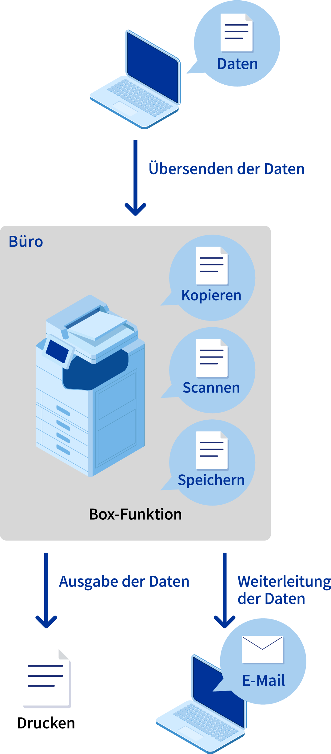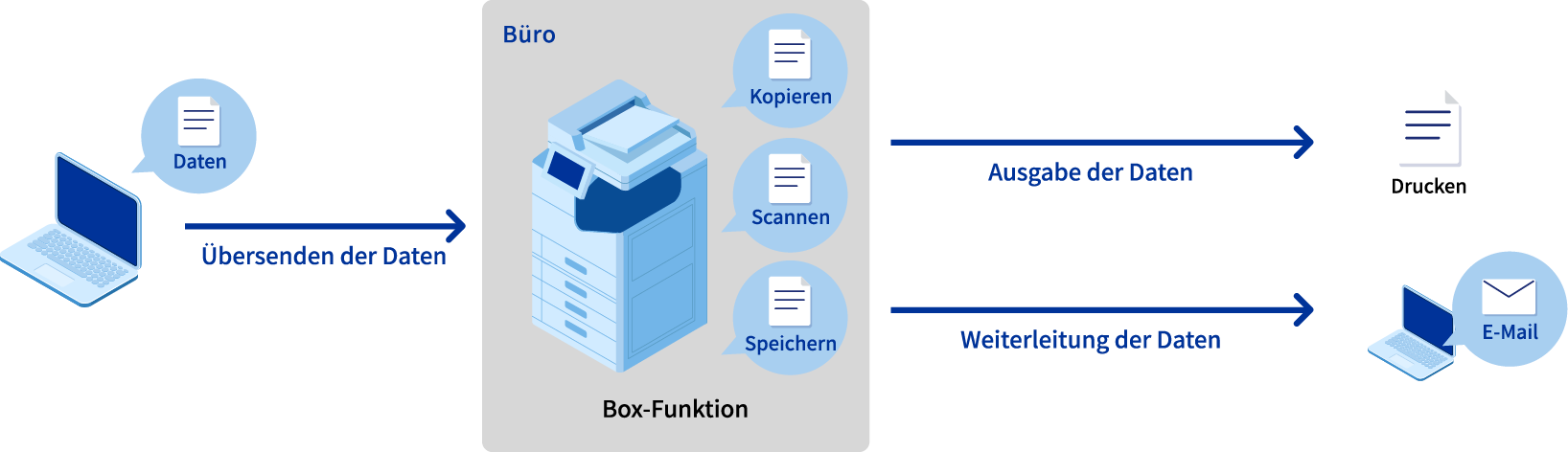 Mit der Funktion „Box“ von Epson Multifunktionsdruckern können Sie die Druckeinstellungen zusammen mit den Druckdaten auf der integrierten Festplatte des Druckers speichern. Das Speichern von Druckdaten in festen Formaten (z. B. Antragsformulare) mit dieser Box-Funktion ermöglicht einen schnellen Druck mit den üblichen Einstellungen, ohne dass dafür ein PC notwendig ist. Sie können sogar Objekte von der Box auf einen PC oder einen Netzwerkordner weiterleiten.