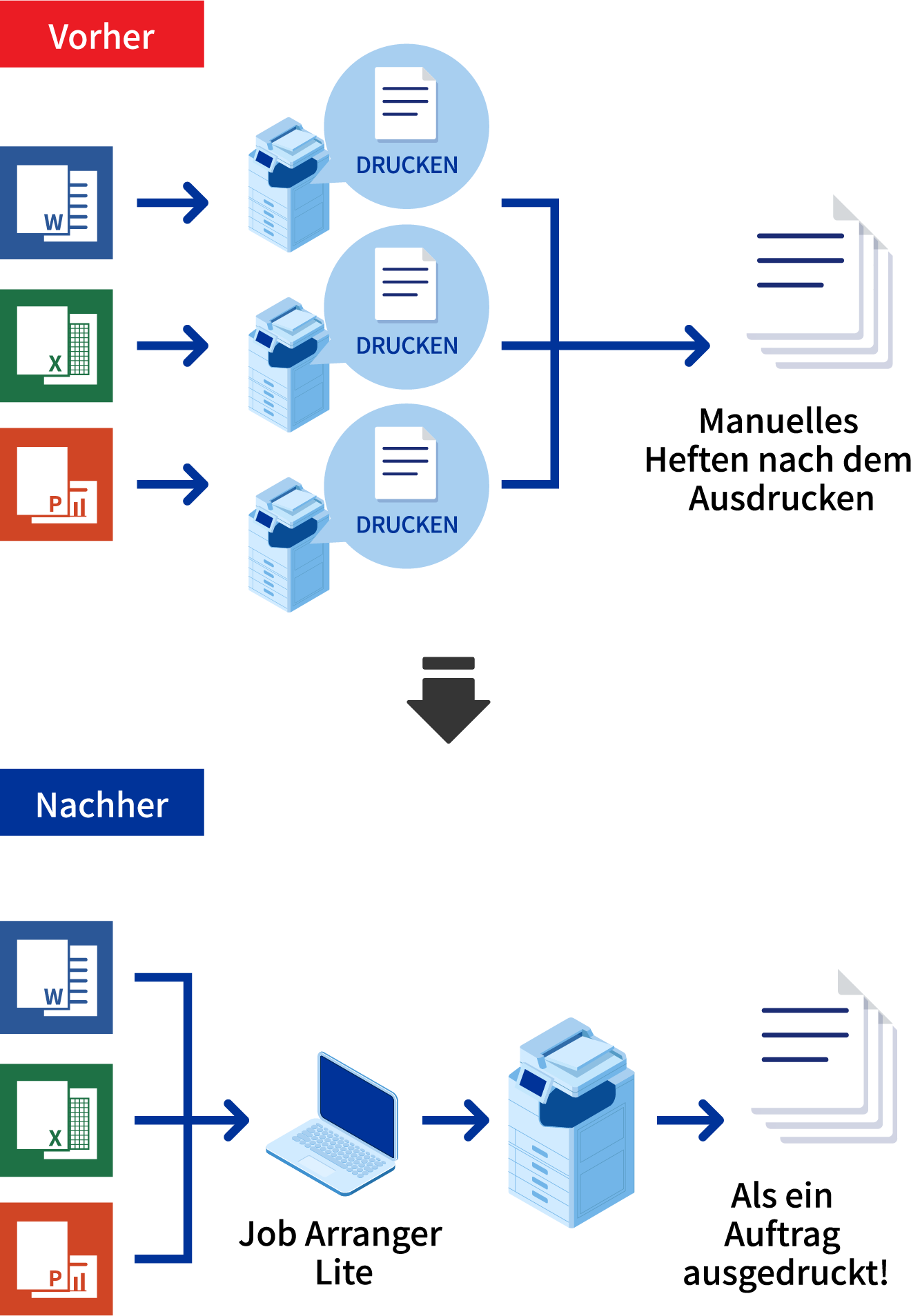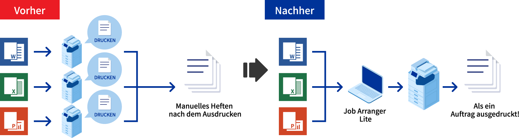 Mit „Job Arranger Lite“ können Sie Dateien aus verschiedenen Anwendungen wie Word®, Excel® oder PowerPoint® kombinieren und dann in einem Stapel drucken. Sie können Einstellungen wie die Druckreihenfolge, den doppelseitigen Druck, die Druckeinstellungen und die Zuordnung nach Ihren Wünschen konfigurieren. Wenn Sie diese Anwendung zusammen mit einem Finisher verwenden, wird die Dokumentenerstellung zum Kinderspiel, sogar das Heften wird übernommen.