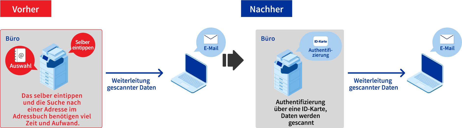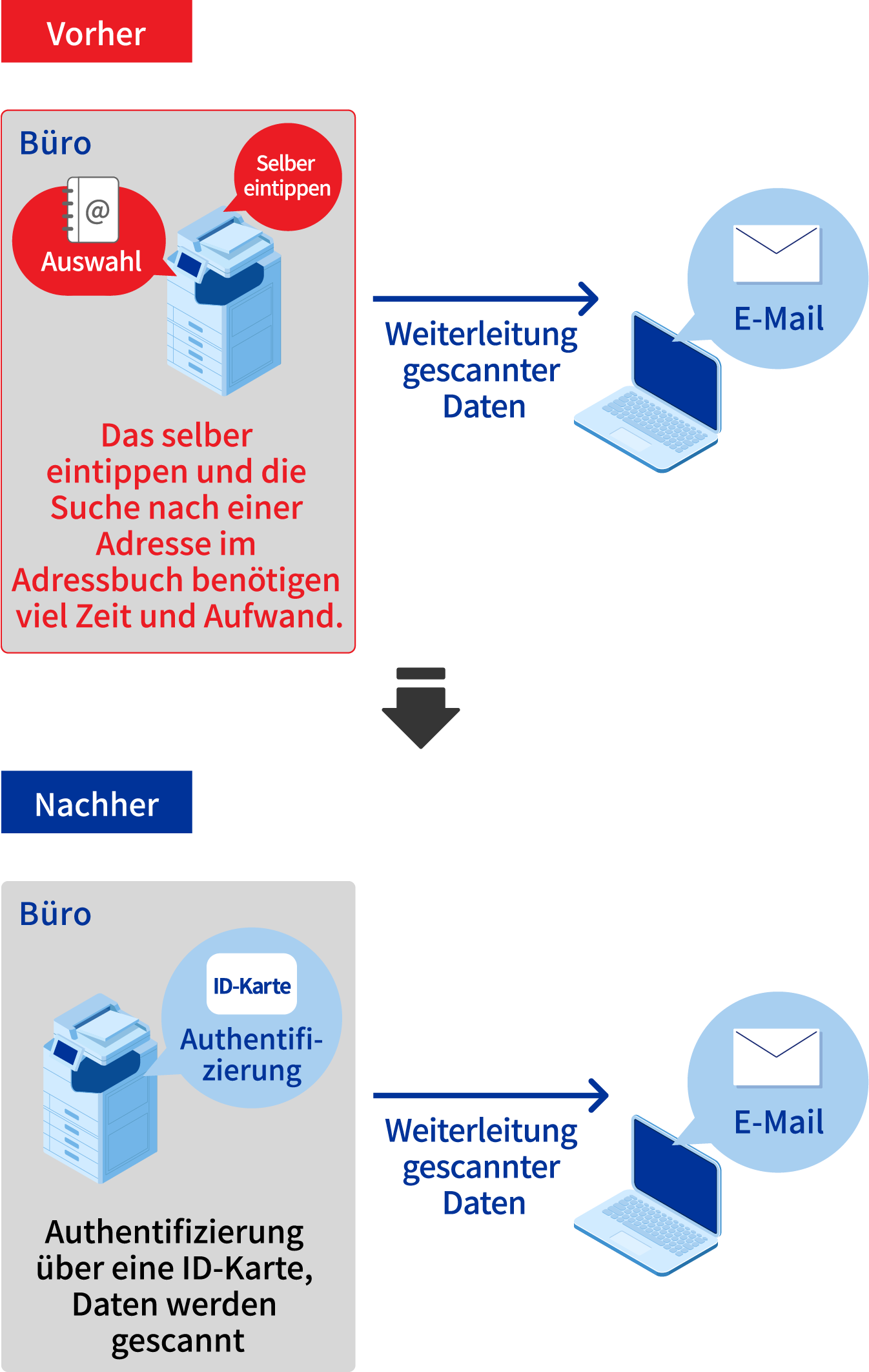 Mit der Funktion „Scan to My E-Mail“ in der authentifizierten Druckoption „Epson Print Admin“ können Sie gescannte Daten an Ihre E-Mail-Adresse senden, ohne diese jedes Mal eingeben zu müssen. Sie benötigen lediglich eine ID-Karte zur Authentifizierung.