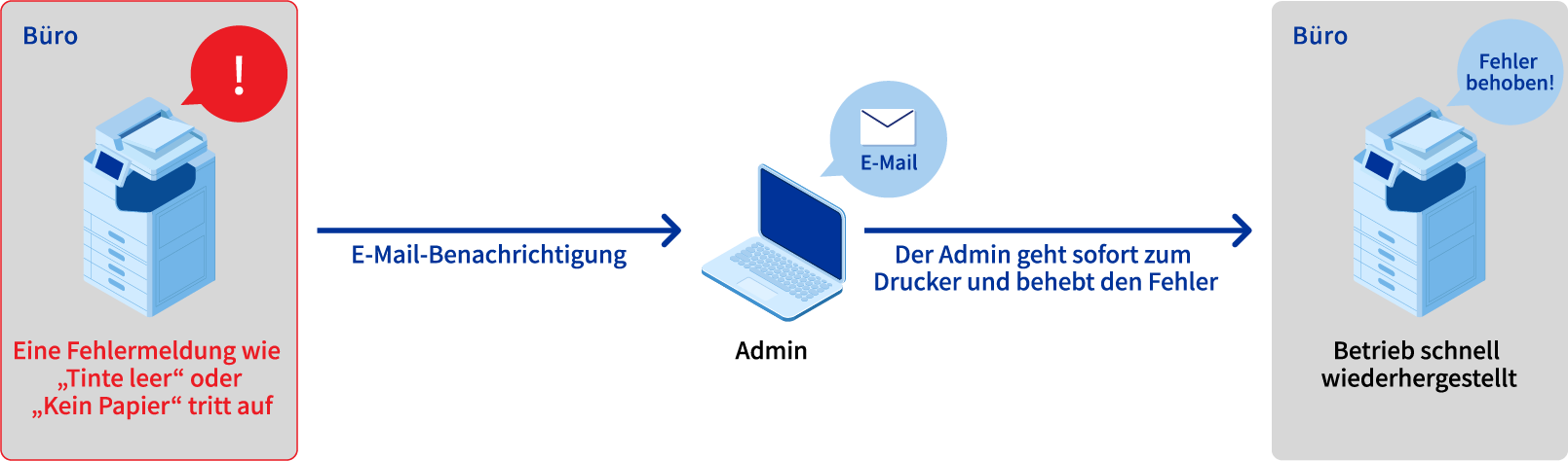 Dadurch bleiben Drucker weniger lange in einem unbrauchbaren Zustand und die Ausfallzeiten werden minimiert.