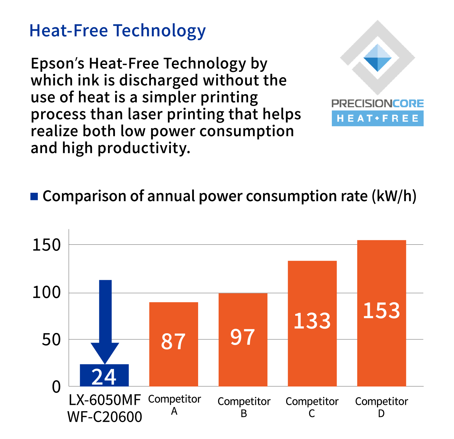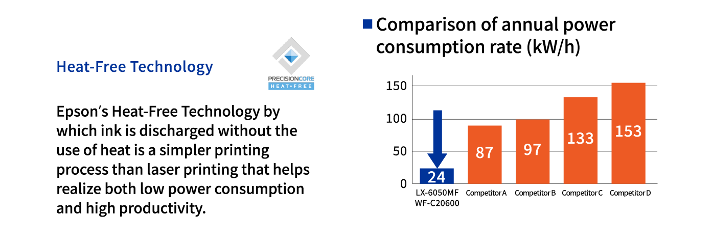 Epson's unique inkjet technology does not utilize heat in the printing process, allowing significant reductions in power consumption compared to laser printers. Reduced power consumption means that CO2 emissions can be lowered as well, so switching from a laser printer to an inkjet printer can also lead to a reduced impact on the environment.