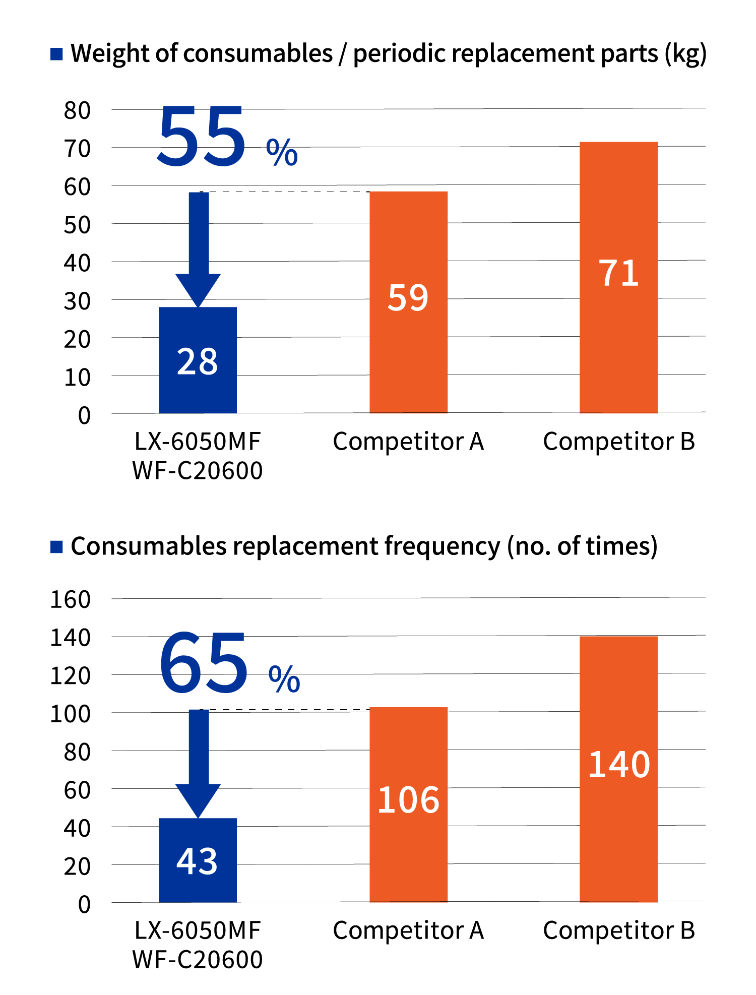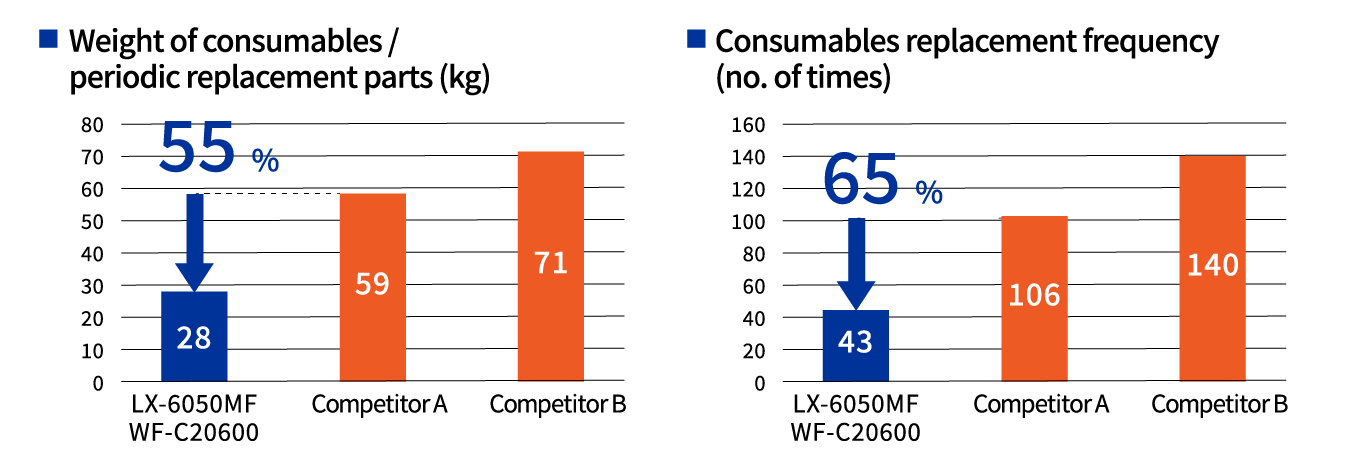Inkjet printers utilize a simple printing process and, unlike laser printers, have few parts that require regular replacement, like photoreceptors and fusing units. A3-size multifunction office printers are used to print relatively large volumes compared to home printers, so laser models require regular replacement of parts* such as photoreceptors. Inkjet multifunction printers have few parts that require replacement and thus help to reduce the environmental impact by consuming fewer resources.