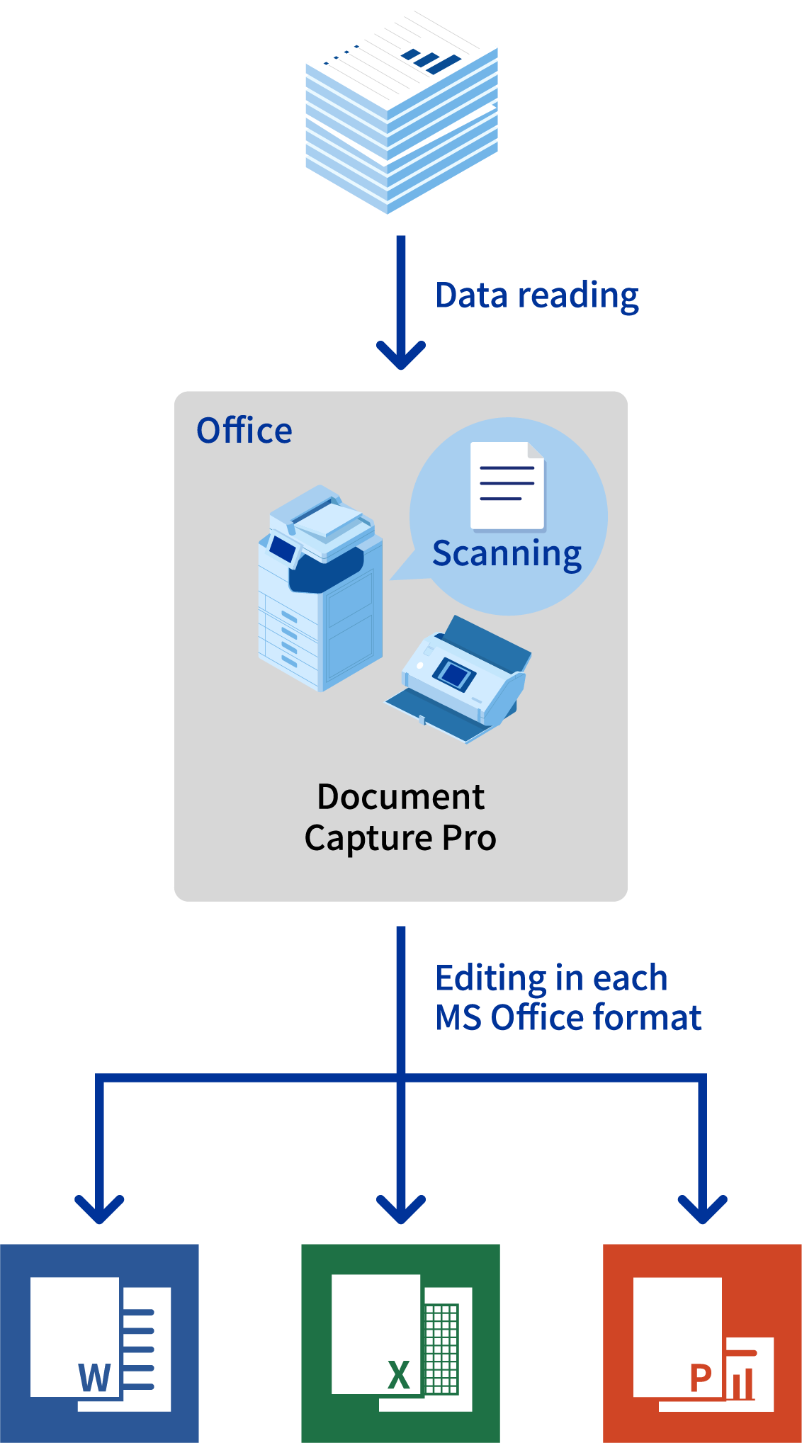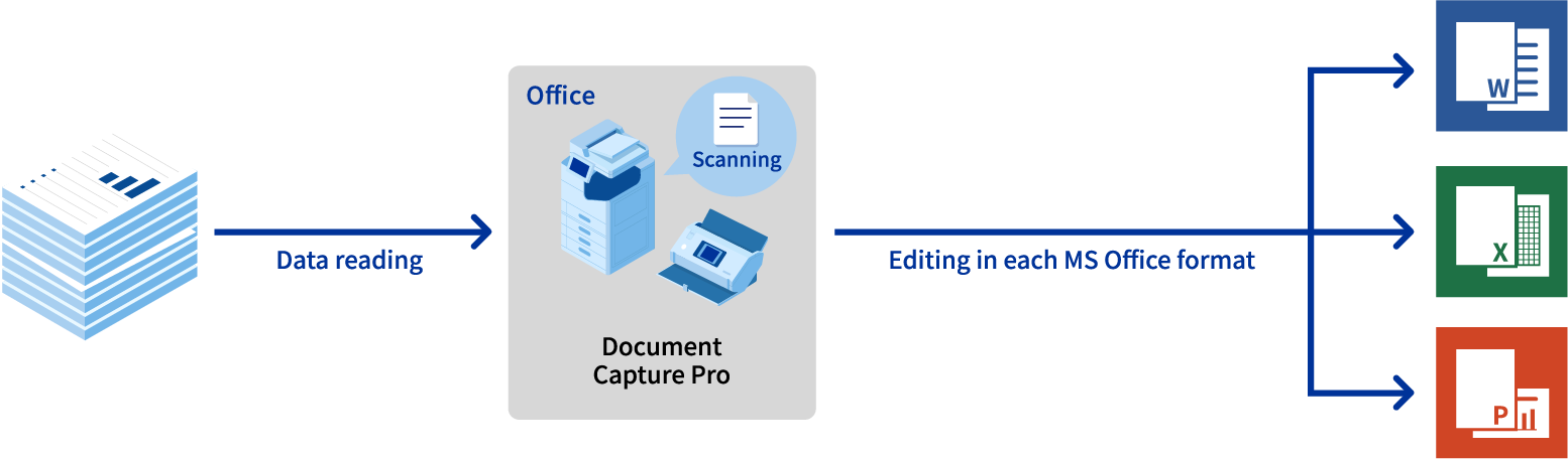 The "Document Capture Pro Enhanced OCR" scanner application makes it easy to convert scanned data into a variety of files such as Excel® and PowerPoint® files. It automatically converts scanned paper documents into files for secondary use.