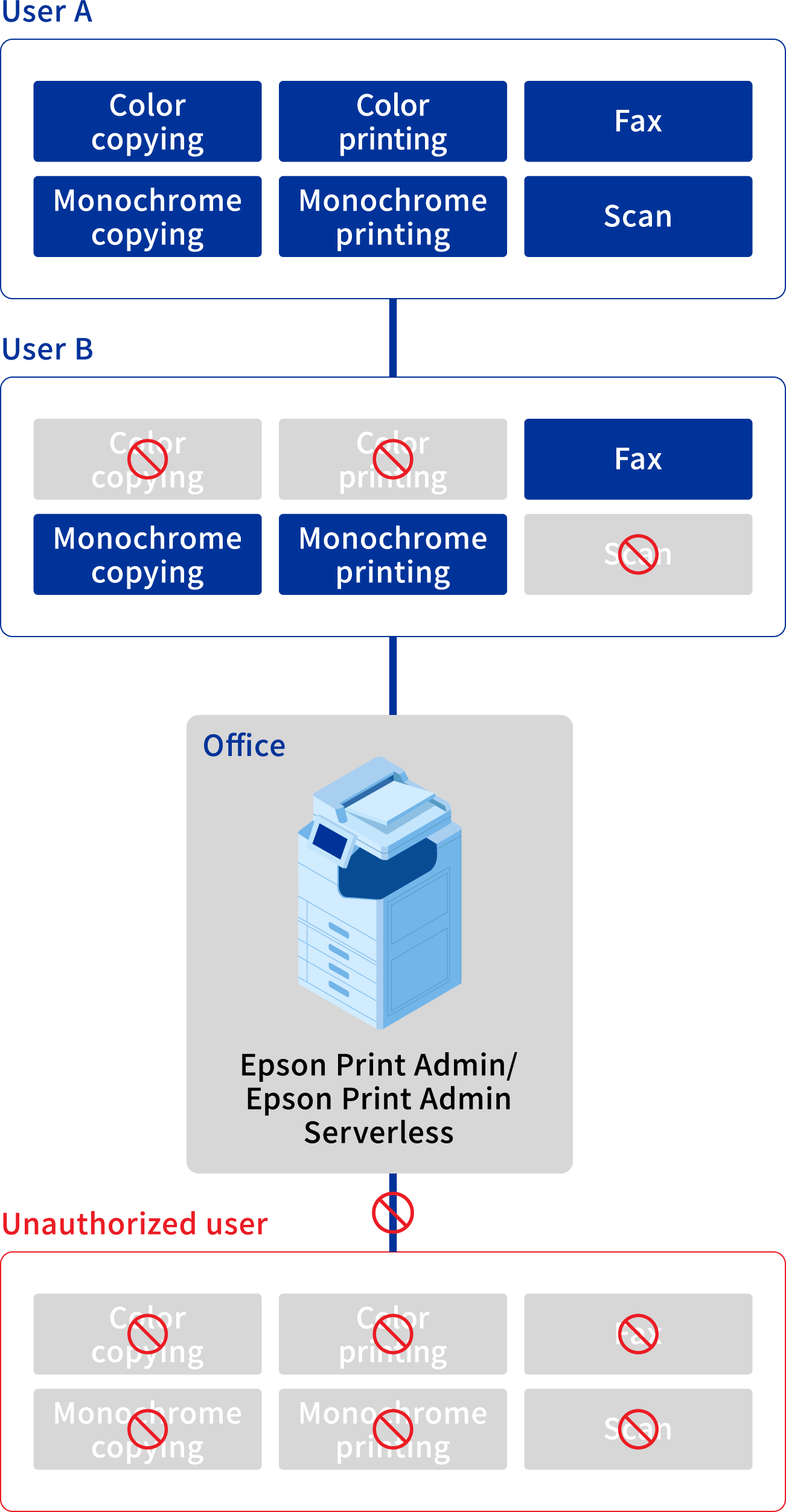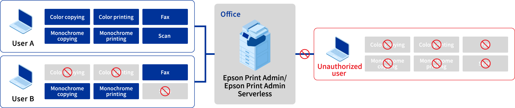 The "Epson Print Admin" authenticated printing option allows IT administrators to configure which functions on the multifunction printer can be used by each user. This prevents unauthorized users from using the multifunction printer, reducing the risk of information leaks.