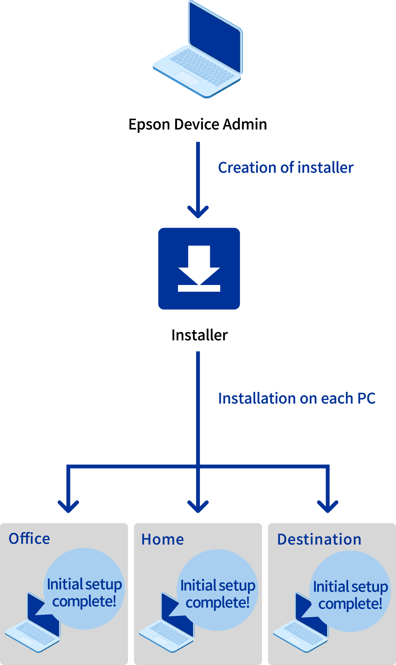 Using the "EpsonNet SetupManager" printer driver installation support tool will let you create and share an installer to easily configure initial settings such as IP and double-sided default settings to comply with your workplace rules, making initial setup less of a chore.