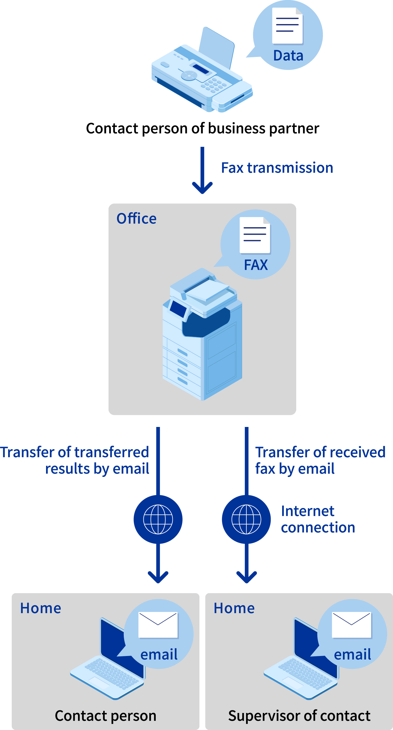 The "Fax to Email" function transfers faxes received to a contact person via e-mail. This allows you to check faxes received at the office while working from home, making work more efficient. It also offers a function that notifies administrators of transfer results by email, allowing tracking and confirmation if problems occur.