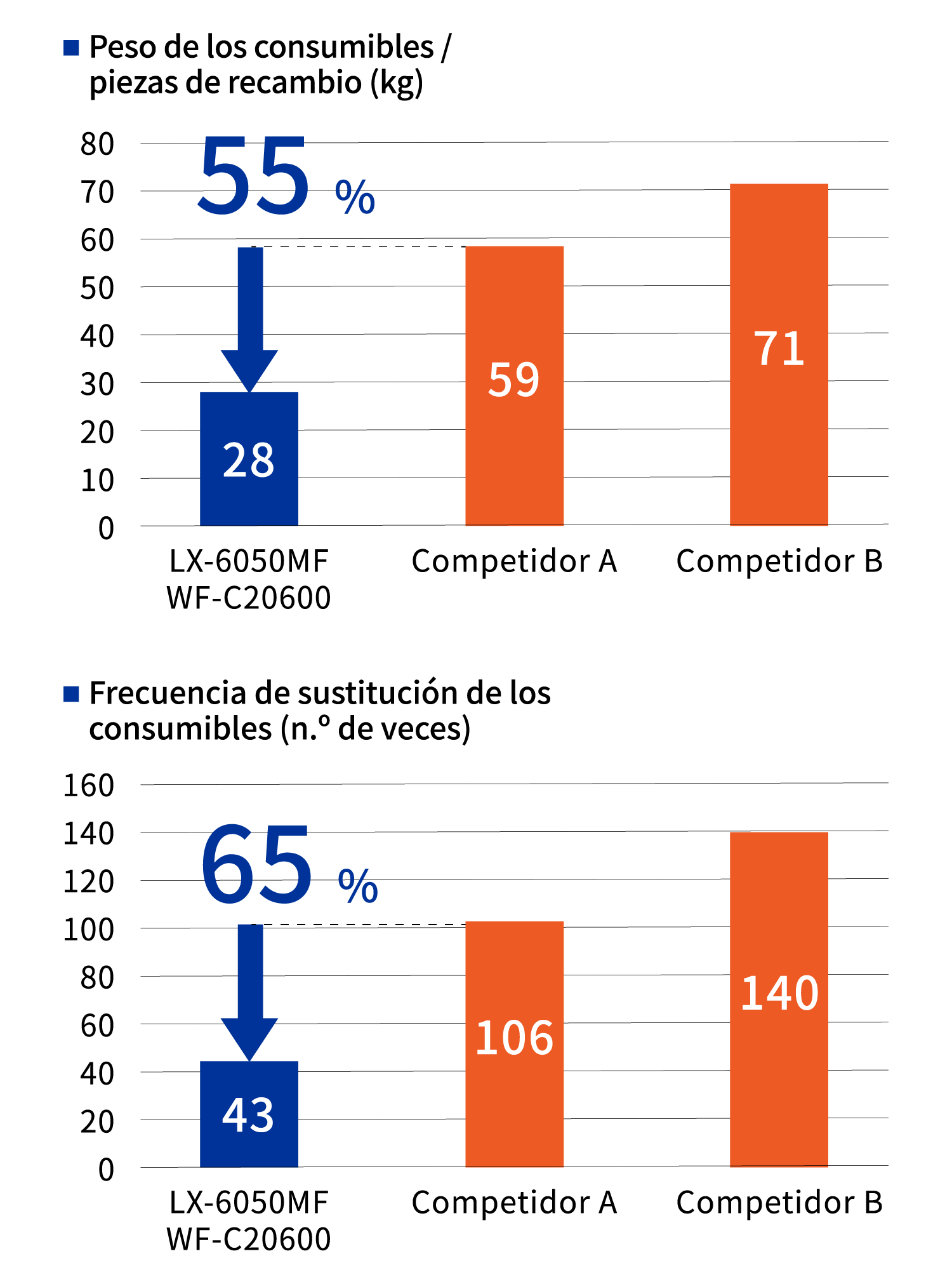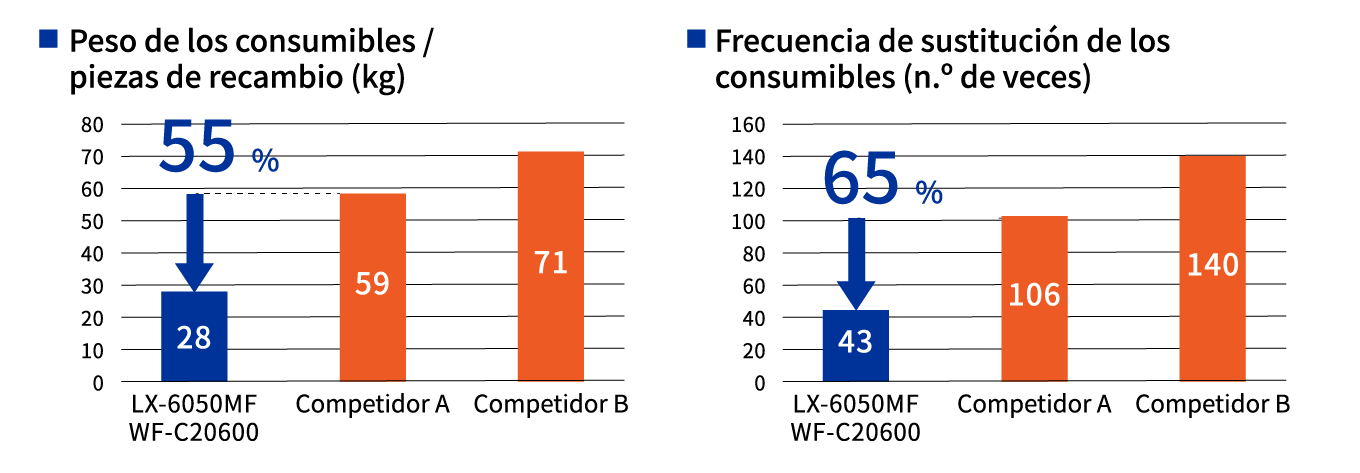 Las impresoras de inyección de tinta utilizan un proceso de impresión sencillo y, a diferencia de las impresoras láser, tienen pocas piezas que requieran una sustitución periódica, como los fotorreceptores y las unidades fusoras. Las impresoras multifunción A3 de oficina se utilizan para la impresión de volúmenes relativamente grandes en comparación con las impresoras domésticas, por lo que los modelos láser requieren de la sustitución periódica de piezas* sometidas a desgaste, como los fotorreceptores. Las impresoras multifunción de inyección de tinta tienen pocas piezas sustituibles, por lo que contribuyen a reducir el impacto medioambiental al consumir menos recursos.