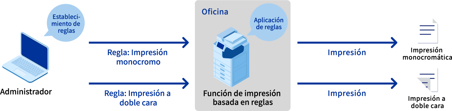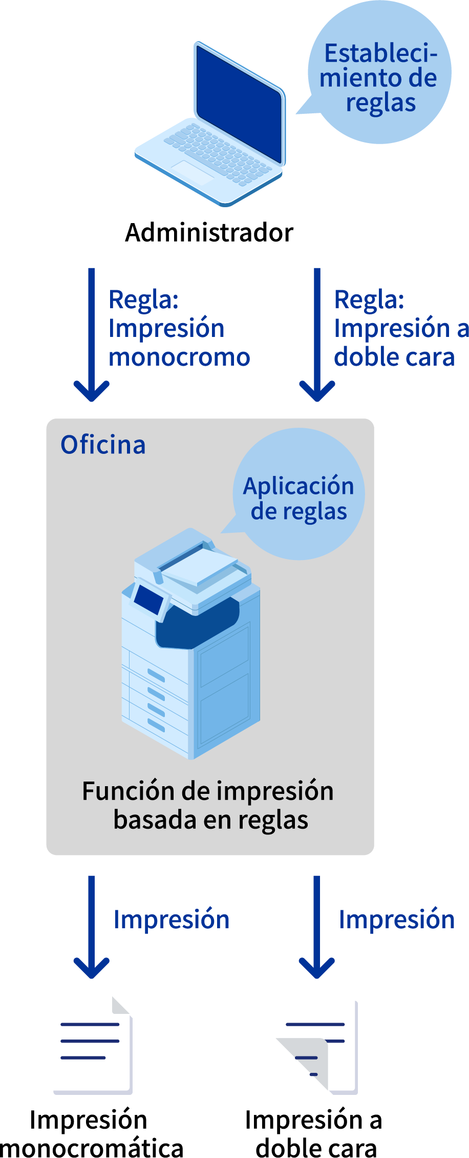 La función de impresión basada en reglas "Epson Print Admin" permite a los administradores predefinir los ajustes de impresión. Puedes establecer reglas para seleccionar de forma automática la impresión monocromo y a doble cara, reduciendo así el consumo de papel y tinta, y contribuyendo a reducir impactos medioambientales y a reducir los costes de impresión.