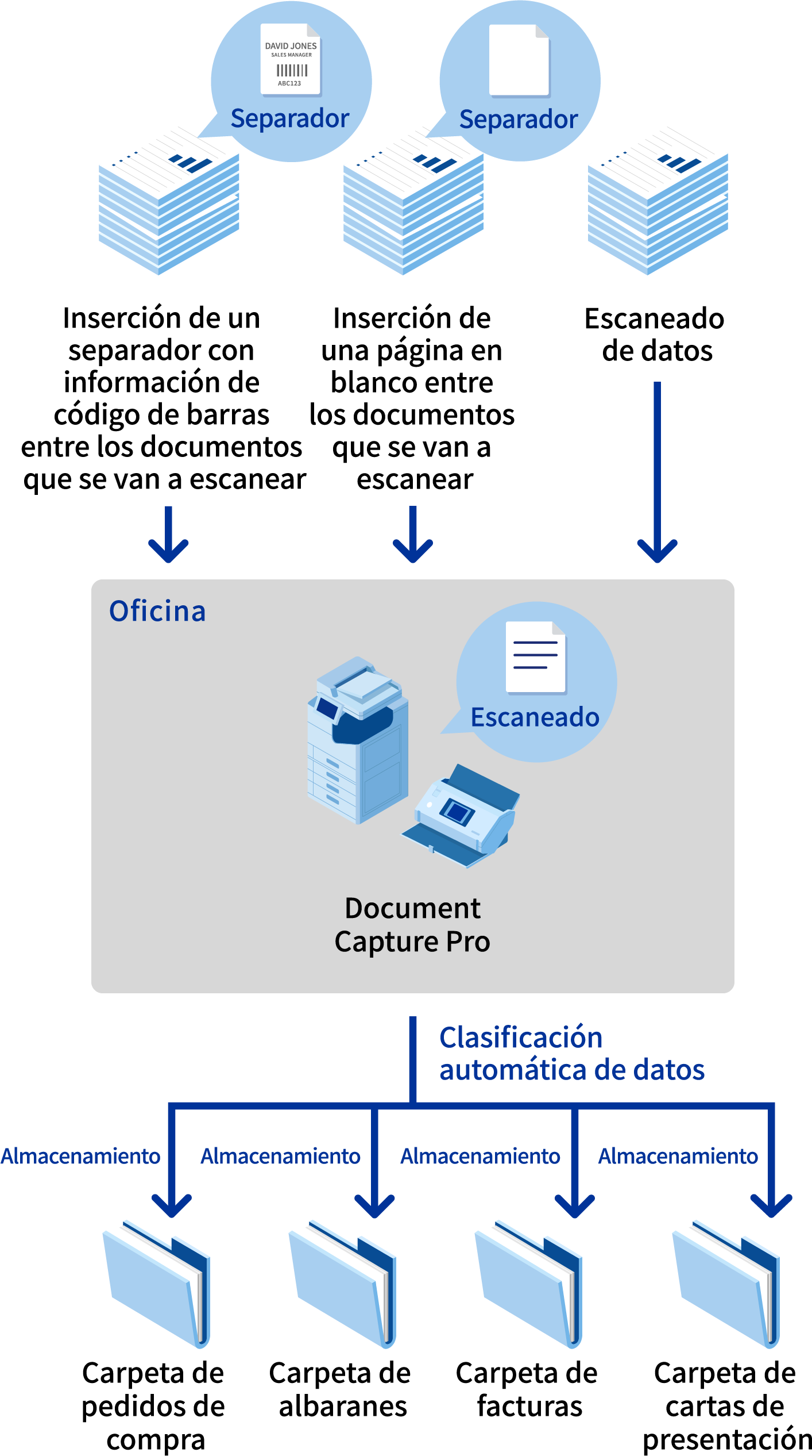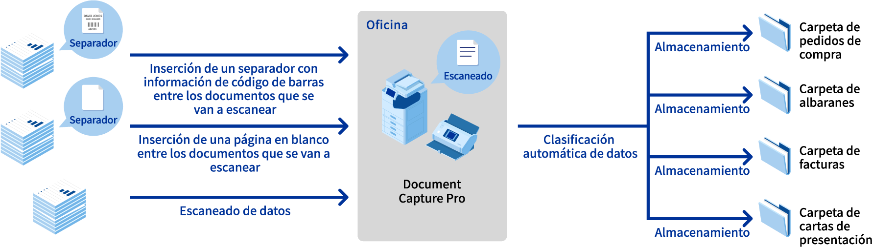 La aplicación de escaneado "Document Capture Pro" permite la clasificación automática de grandes volúmenes de documentos en papel digitalizados. Los datos escaneados pueden guardarse en carpetas designadas simplemente insertando una página en blanco o un separador con información de código de barras entre los documentos que se van a escanear, y después estos datos pueden adjuntarse a correos electrónicos o trasladarse a un servicio en la nube.