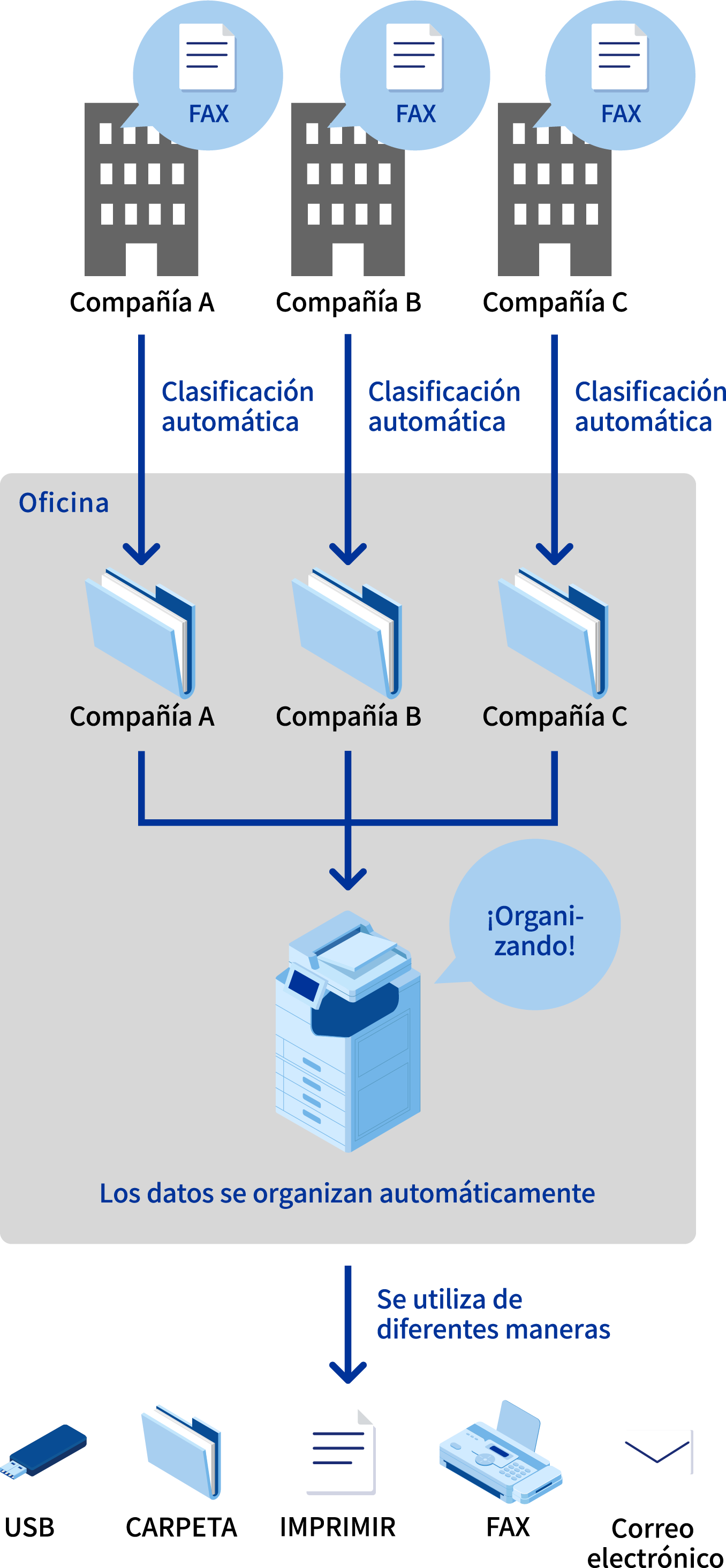 Los datos de fax recibidos pueden guardarse automáticamente en el buzón de fax del propio dispositivo, en una carpeta designada, en la nube o en una memoria USB; o bien pueden enviarse por correo electrónico, en función de parámetros como su origen, la línea receptora o la hora de recepción. Hay disponibles vistas previas de los datos guardados, lo que permite a los usuarios elegir solo lo necesario.