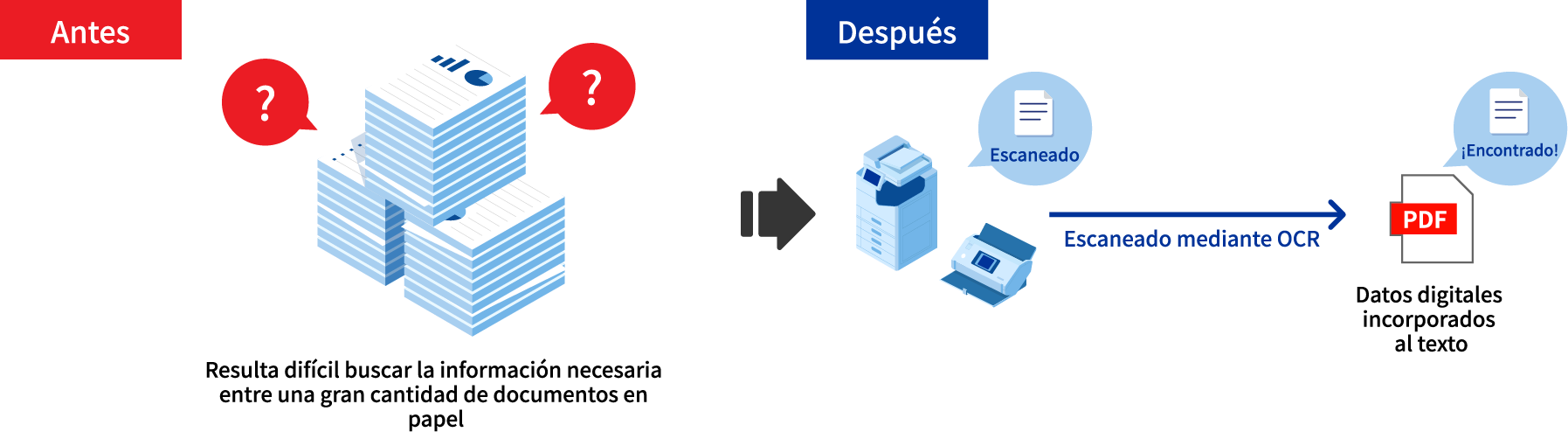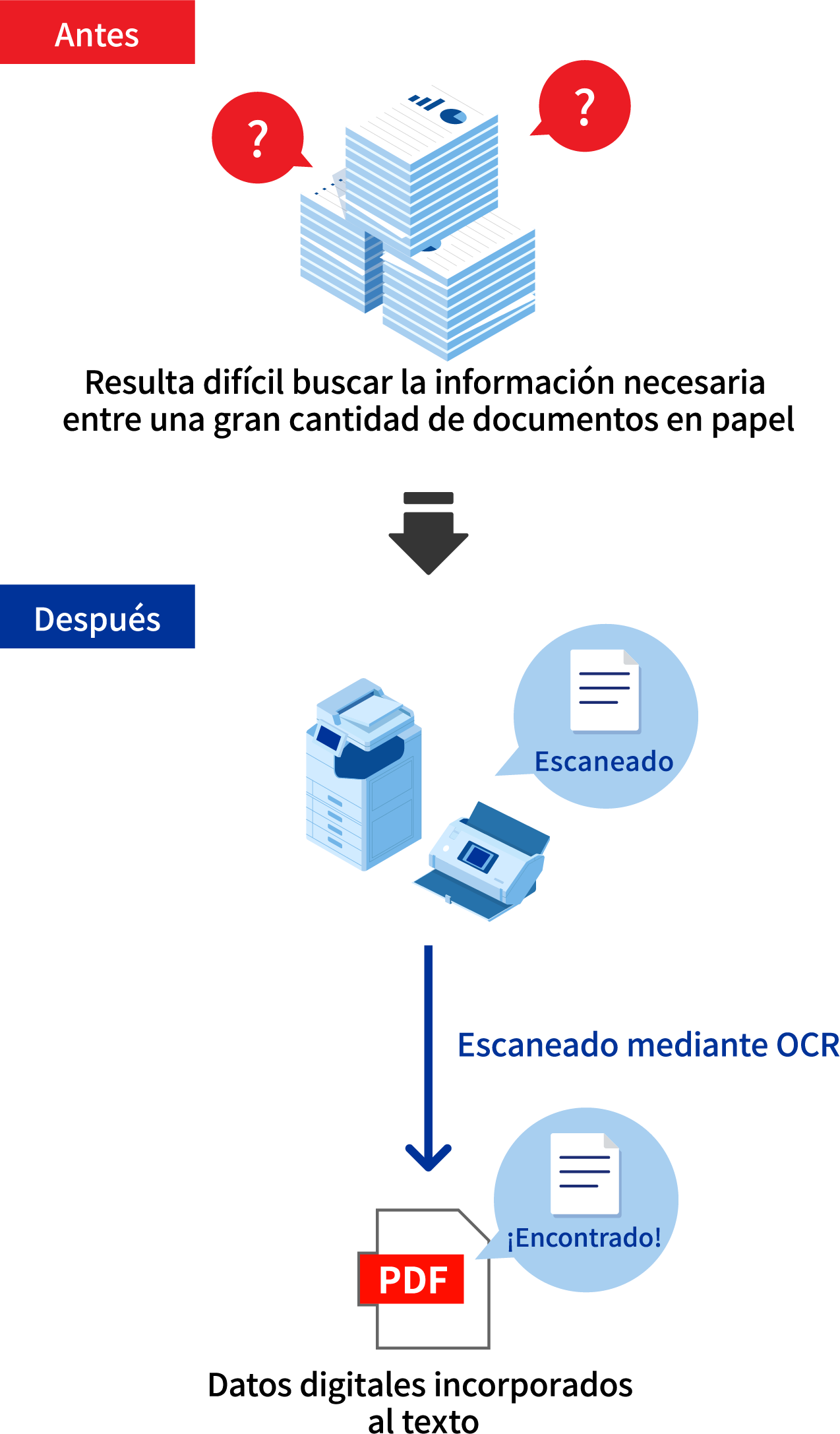 Cuando se utiliza junto con software OCR, la aplicación para escáneres "Document Capture Pro" permite convertir los datos escaneados a PDF con capacidad de búsqueda, lo que facilita ubicar la información. En los productos de la serie AM, la función OCR está disponible de forma independiente.