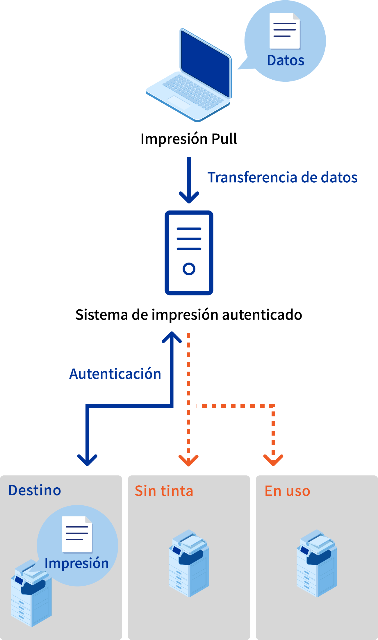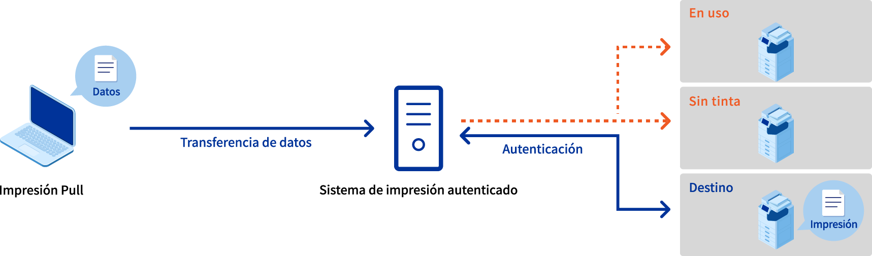 El uso de la función "Impresión Pull" en la opción de impresión autenticada "Epson Print Admin" te permite imprimir desde una impresora multifunción disponible, evitando las que están en uso, sin papel o sin tinta, o en procesos de mantenimiento.