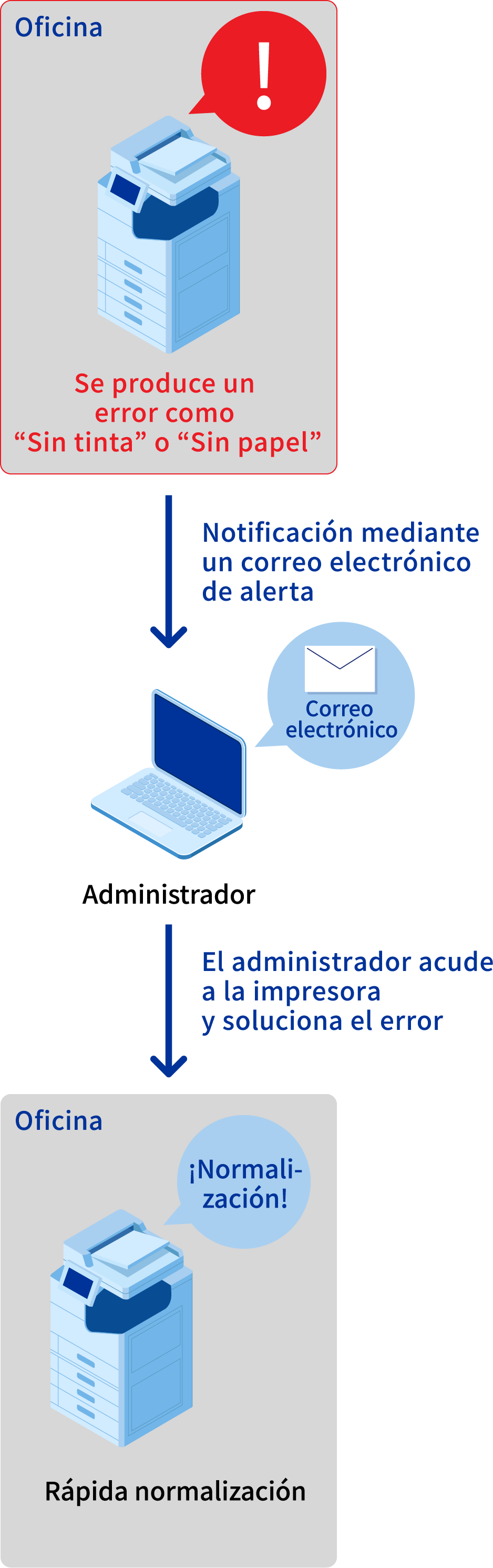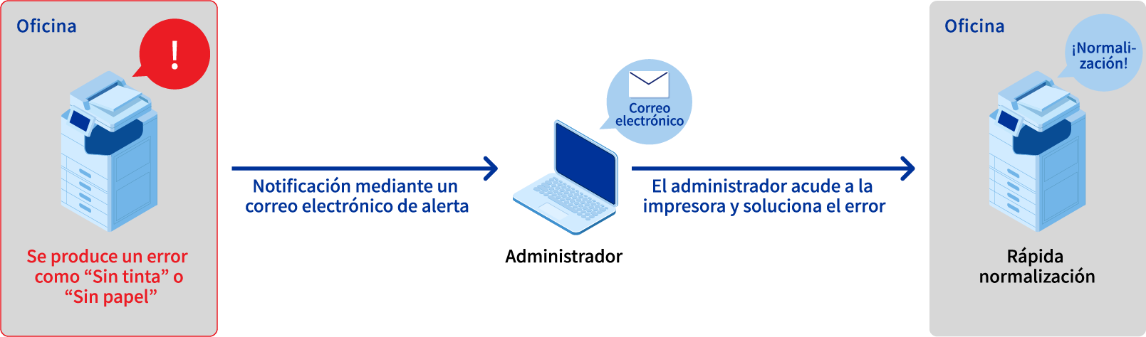 Las impresoras multifunción de inyección de tinta Epson envían un correo electrónico al administrador cuando se quedan sin papel o sin tinta. Esto permite al administrador de sistemas acudir rápidamente a la impresora y solucionar la incidencia. Incluso cuando se gestionan varias impresoras, no es necesario que el administrador vaya a cada una de ellas para comprobar su estado. Esto evita que las impresoras se queden sin posibilidad de uso y minimiza el tiempo de inactividad.