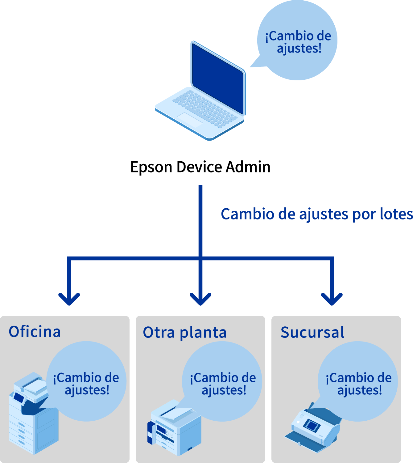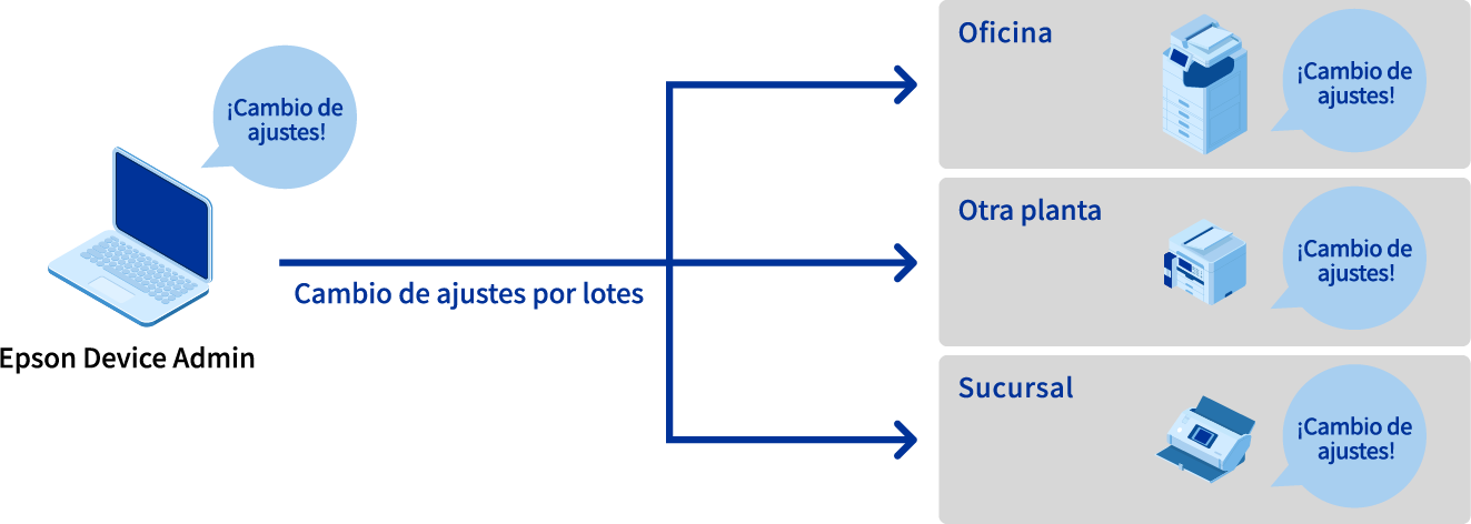 "Epson Device Admin" te permite configurar dispositivos en bloque mediante operaciones remotas a través de una red. Esto te permite migrar con facilidad las libretas de direcciones y la información de los dispositivos anteriores a la migración.