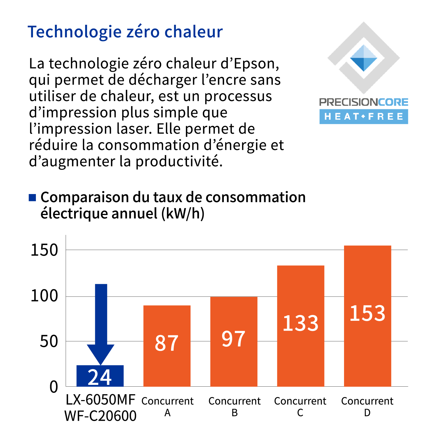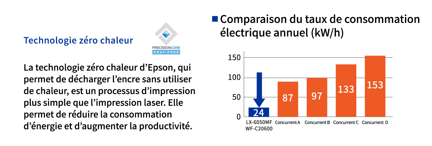 La technologie jet d’encre unique d’Epson n’utilise pas de chaleur lors du processus d’impression, réduisant ainsi de façon significative la consommation d’énergie par rapport aux imprimantes laser.