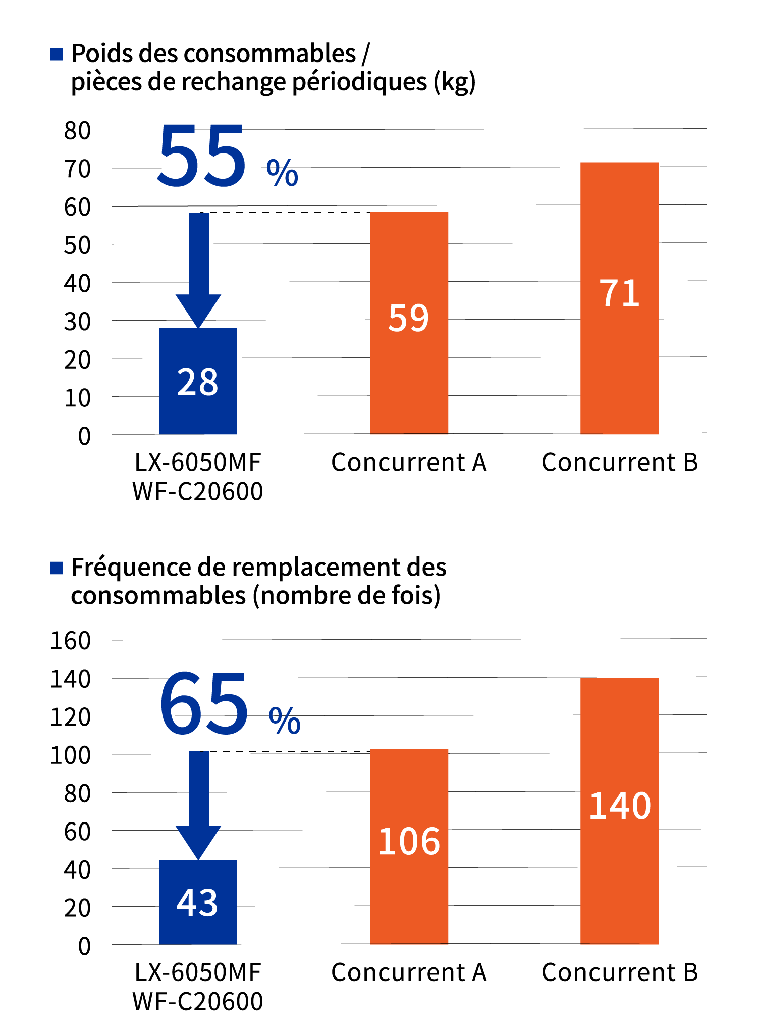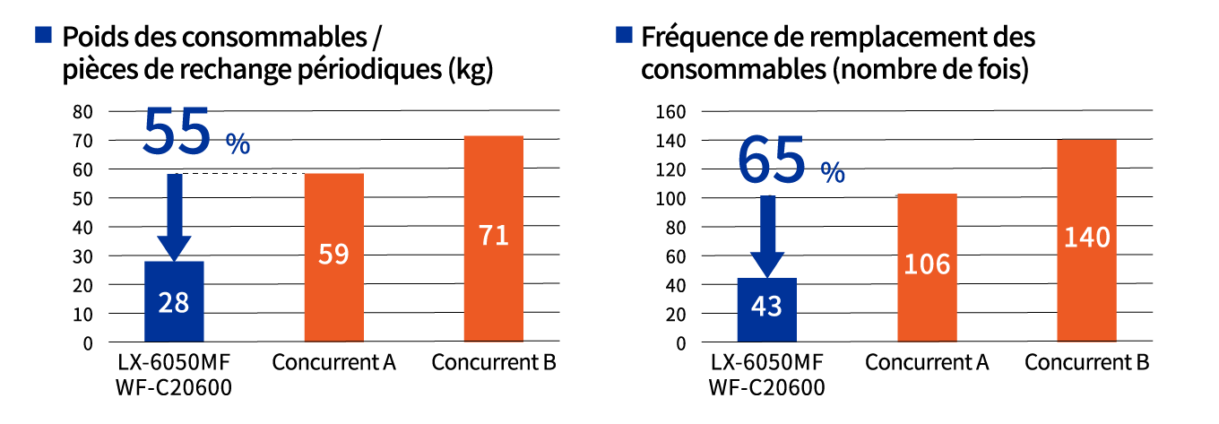 Les imprimantes Jet d'Encre Professionnel utilisent un processus d’impression simple. Contrairement aux imprimantes laser, elles comportent peu de pièces qui doivent être remplacées régulièrement, telles que les tambours photorécepteurs et les unités de fusion. Les imprimantes bureautiques multifonctions de format A3 sont utilisées pour imprimer des volumes relativement importants par rapport aux imprimantes domestiques. Les modèles laser nécessitent donc un remplacement régulier des pièces* comme les tambours photorécepteurs. Les solutions d'impression Jet d'Encre Professionnel comportant peu de pièces à remplacer et consommant moins de ressources, les répercussions environnementales sont réduites.