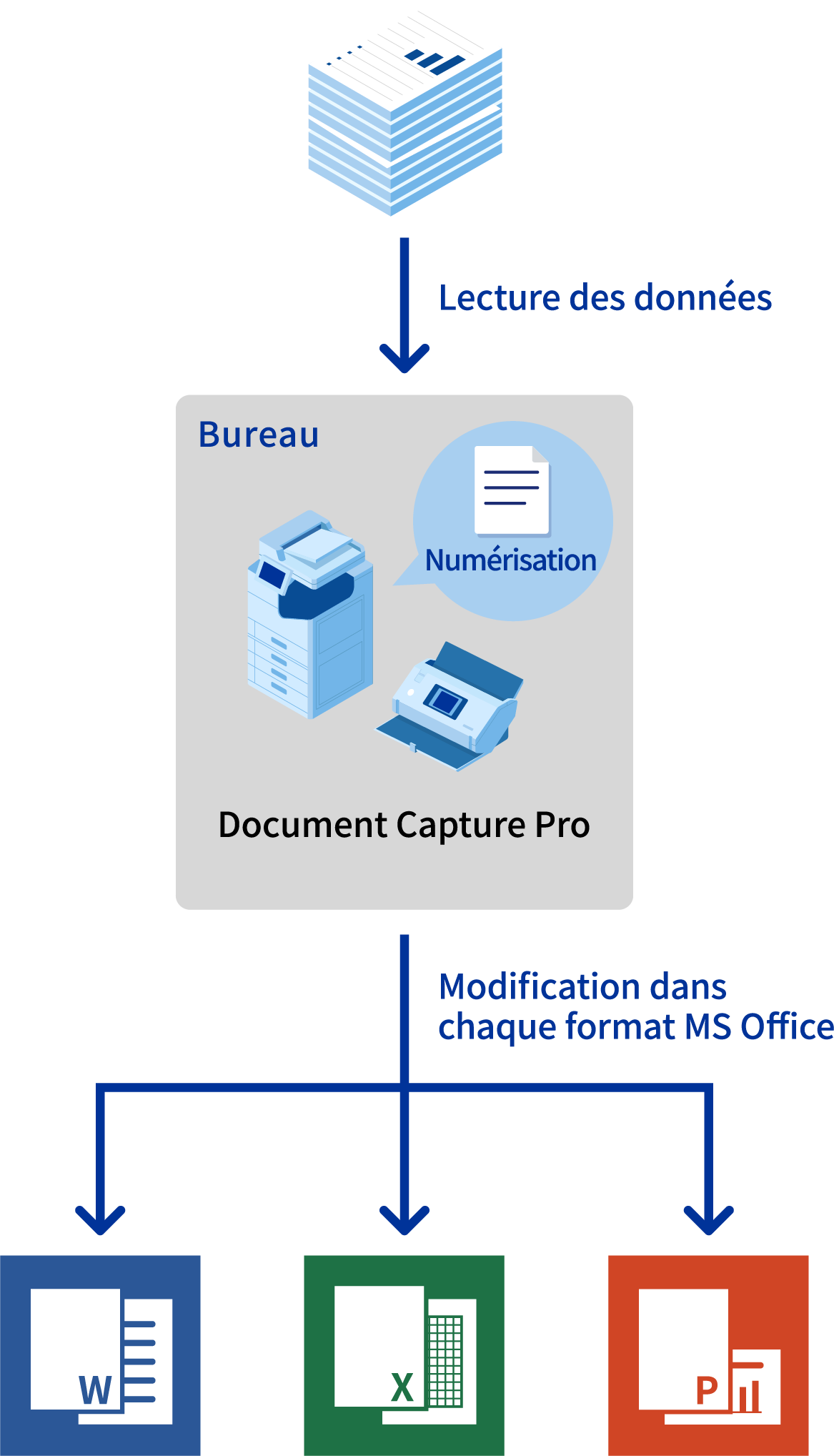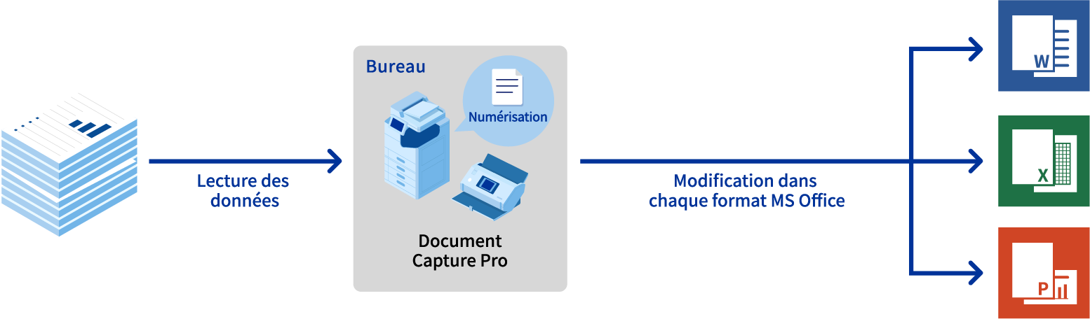 Grâce au logiciel de capture documentaire « Document Capture Pro Enhanced OCR », convertir des données numérisées en une variété de fichiers tels qu’Excel® et PowerPoint® devient plus facile. Les documents papier numérisés sont automatiquement convertis en fichiers en vue d’une réutilisation.