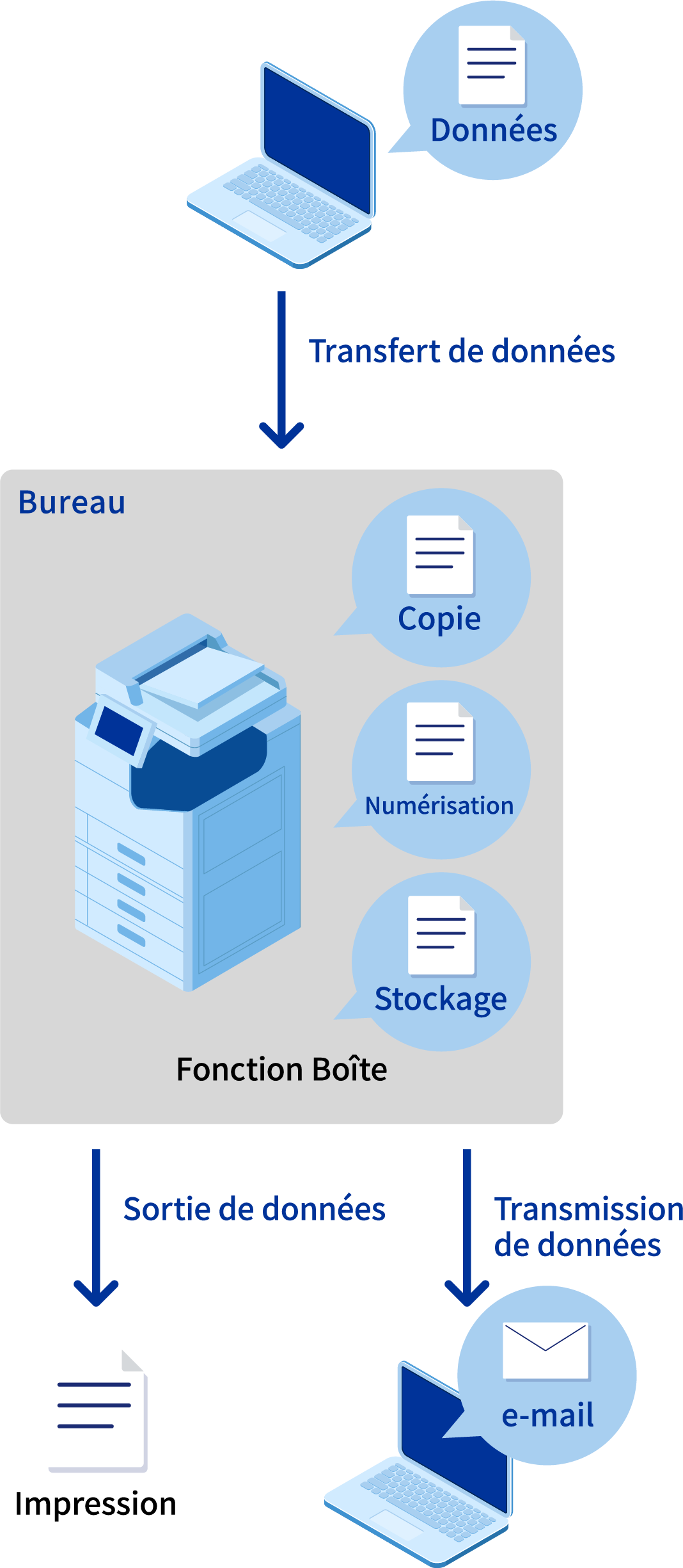 La fonction « Boîte » des solutions d'impression Epson vous permet d’enregistrer les paramètres d’impression et les données d’impression sur le disque dur interne du multifonction. Le stockage des données d’impression au format fixe (telles que les formulaires de demande) à l’aide de cette fonction permet d’imprimer rapidement avec les paramètres habituels, sans avoir à utiliser un PC. Vous pouvez même transférer des éléments depuis la Boîte vers un PC ou un dossier réseau.