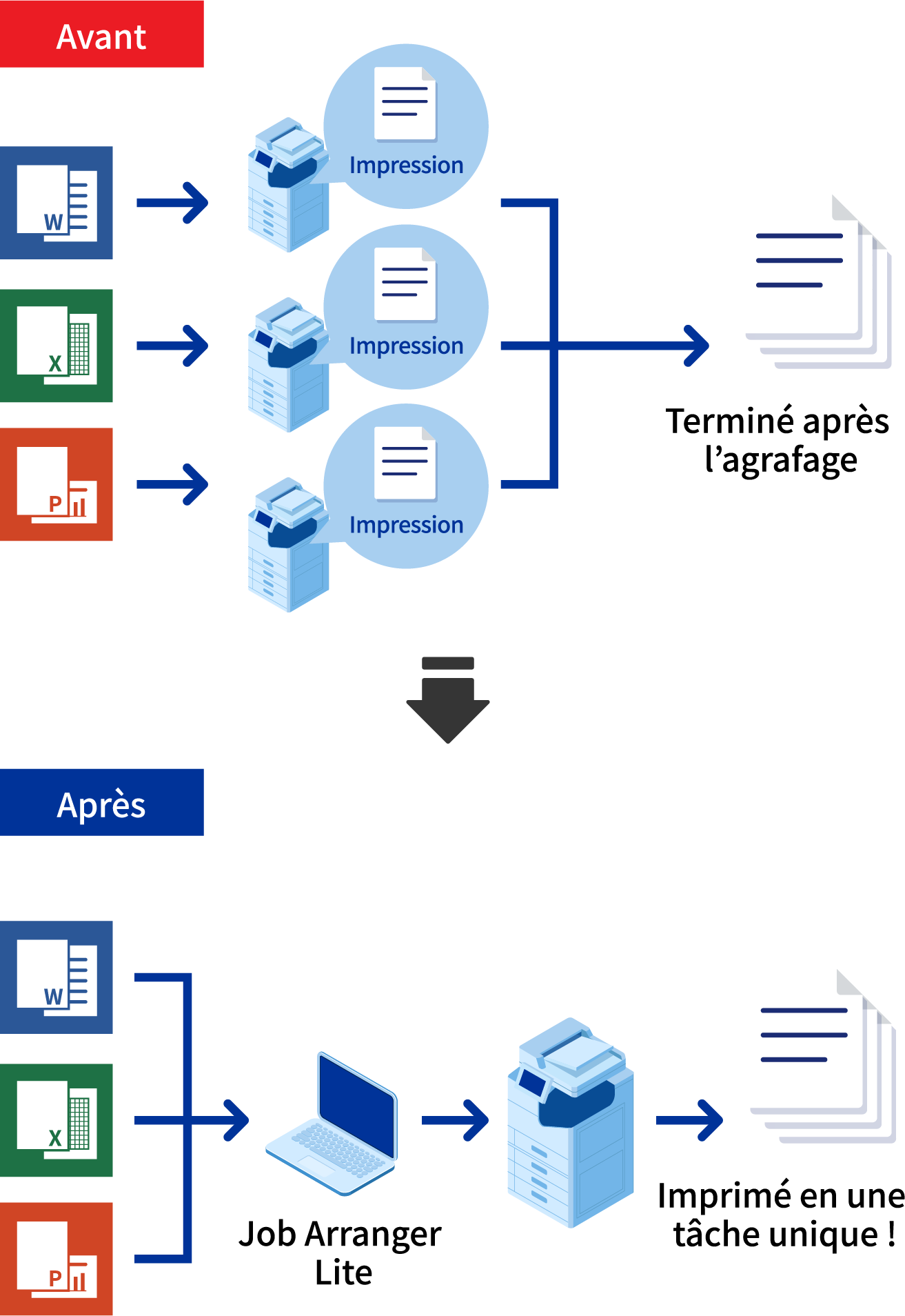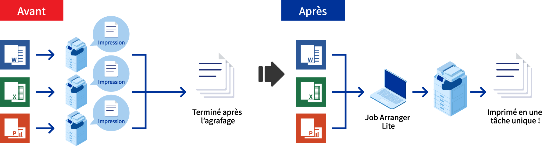 Grâce à « Job Arranger Lite », vous pouvez associer les fichiers provenant d’applications différentes telles que Word®, Excel®, ou PowerPoint®, puis les imprimer en une seule fois. Vous pouvez configurer des paramètres tels que l’ordre d’impression, l’impression recto verso, les paramètres d’impression, et la répartition en fonction de vos préférences. L’utilisation de cette application avec un finisseur supprime les inconvénients de la création de documents, et veille même à leur agrafage.