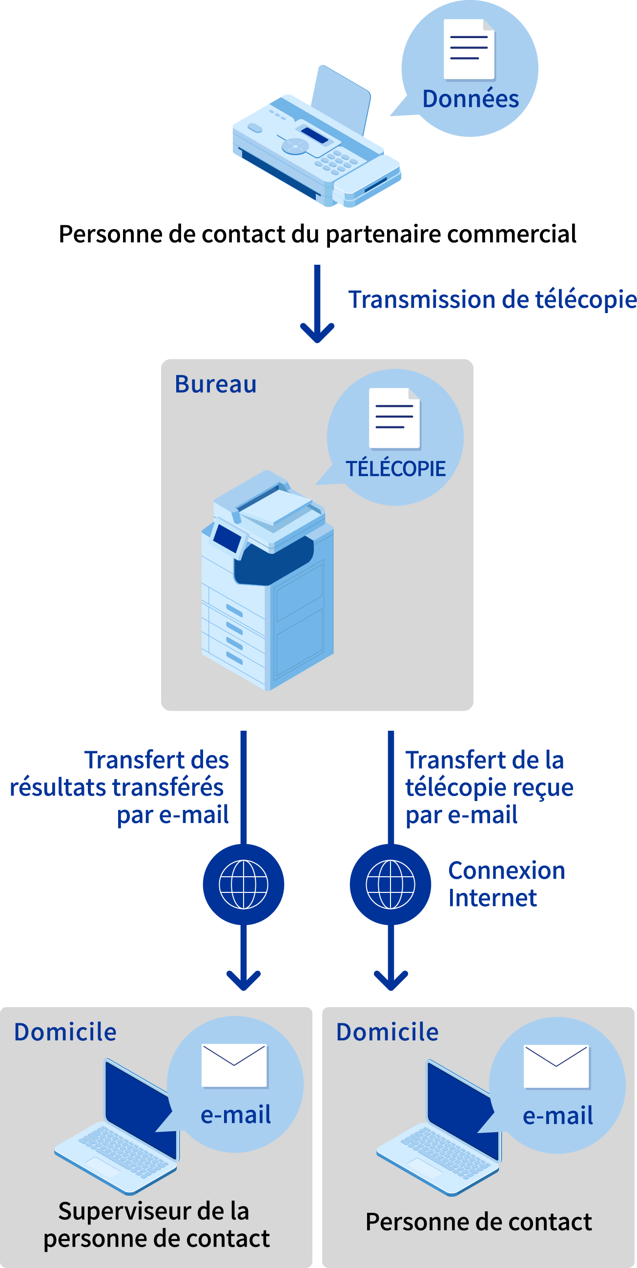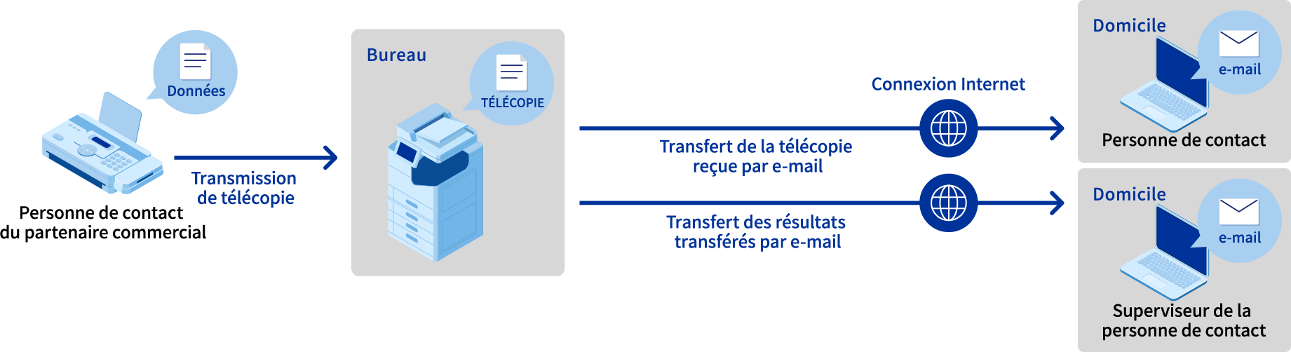La fonction « Télécopier vers une adresse e-mail » transfère par e-mail les télécopies reçues à un contact. Vous pouvez ainsi consulter les télécopies reçues au bureau en travaillant depuis chez vous, pour un travail plus efficace. Elle comporte également une fonction qui avertit les administrateurs des résultats du transfert par e-mail afin de garantir le suivi et la confirmation en cas de problème.