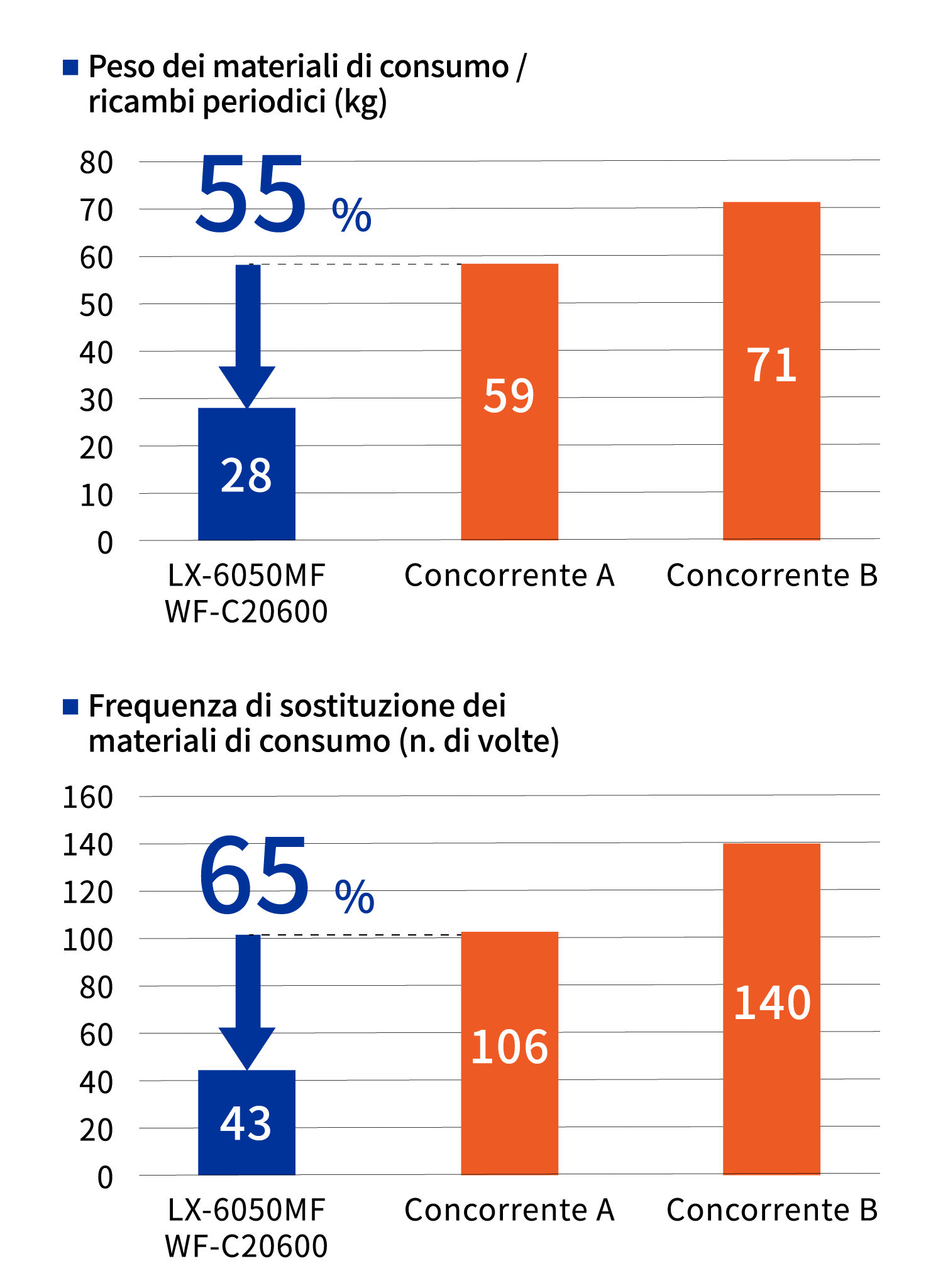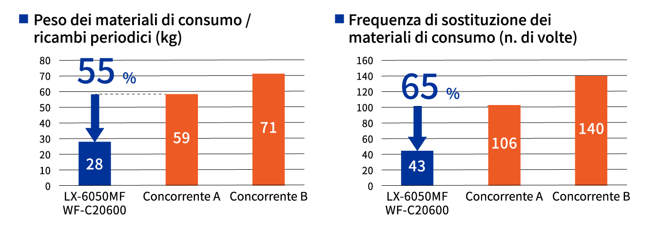 Le stampanti a getto d'inchiostro utilizzano un processo di stampa semplice e, a differenza delle stampanti laser, hanno pochi componenti che richiedono una sostituzione regolare, come i fotoconduttori e le unità fusore. Le stampanti multifunzione da ufficio in formato A3 vengono utilizzate per stampare volumi relativamente grandi rispetto alle stampanti per uso domestico; per questo, i modelli laser richiedono la sostituzione regolare di componenti* come i fotoconduttori. Le stampanti multifunzione a getto d'inchiostro hanno poche parti da sostituire e quindi contribuiscono a ridurre l'impatto ambientale attraverso un minor consumo di risorse.