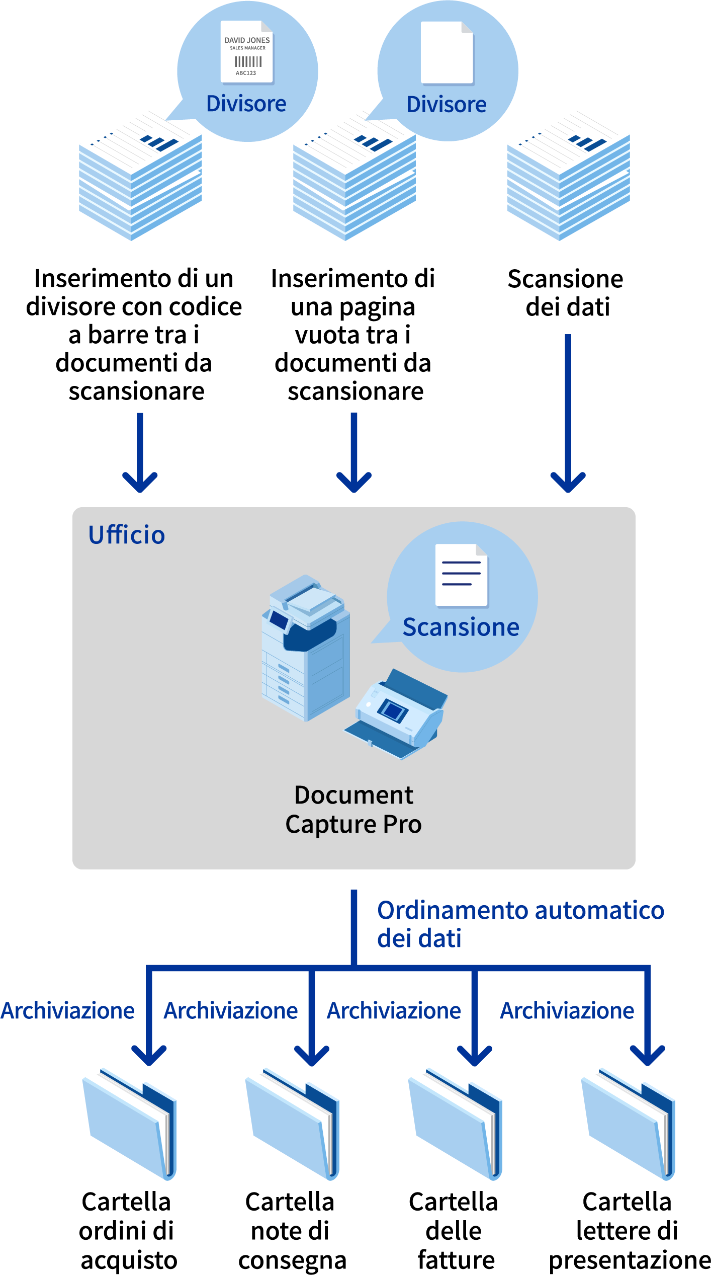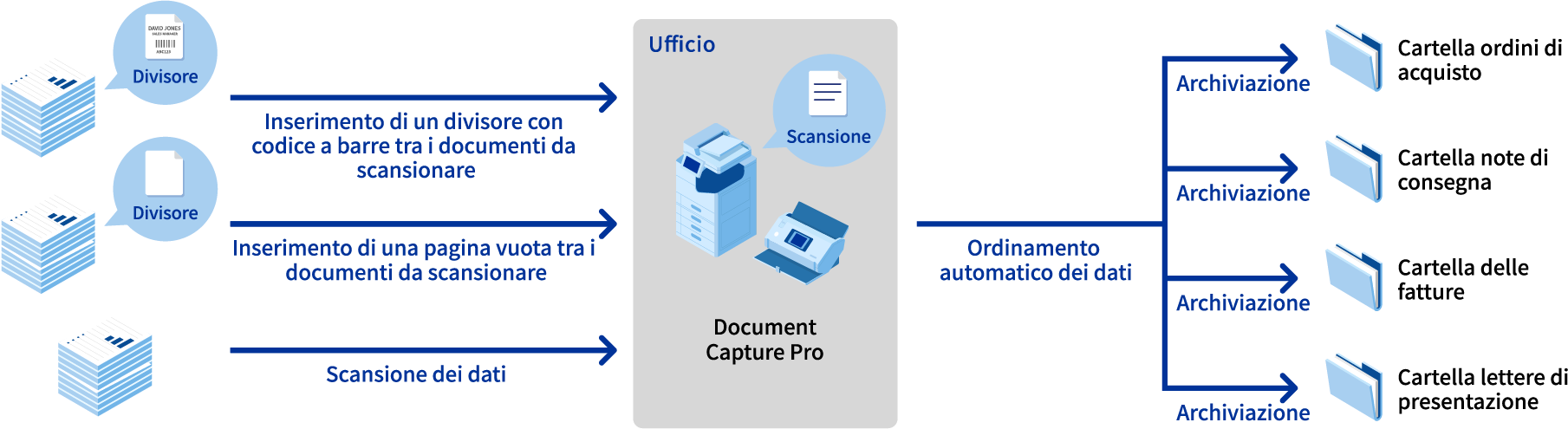 L'applicazione per scanner "Document Capture Pro" consente di ordinare automaticamente grandi volumi di documenti cartacei scansionati. I dati scansionati possono essere salvati in cartelle designate inserendo semplicemente una pagina vuota o un divisore con codice a barre tra i documenti da scansionare; quindi, i dati possono essere allegati tramite e-mail o spostati su cloud.
