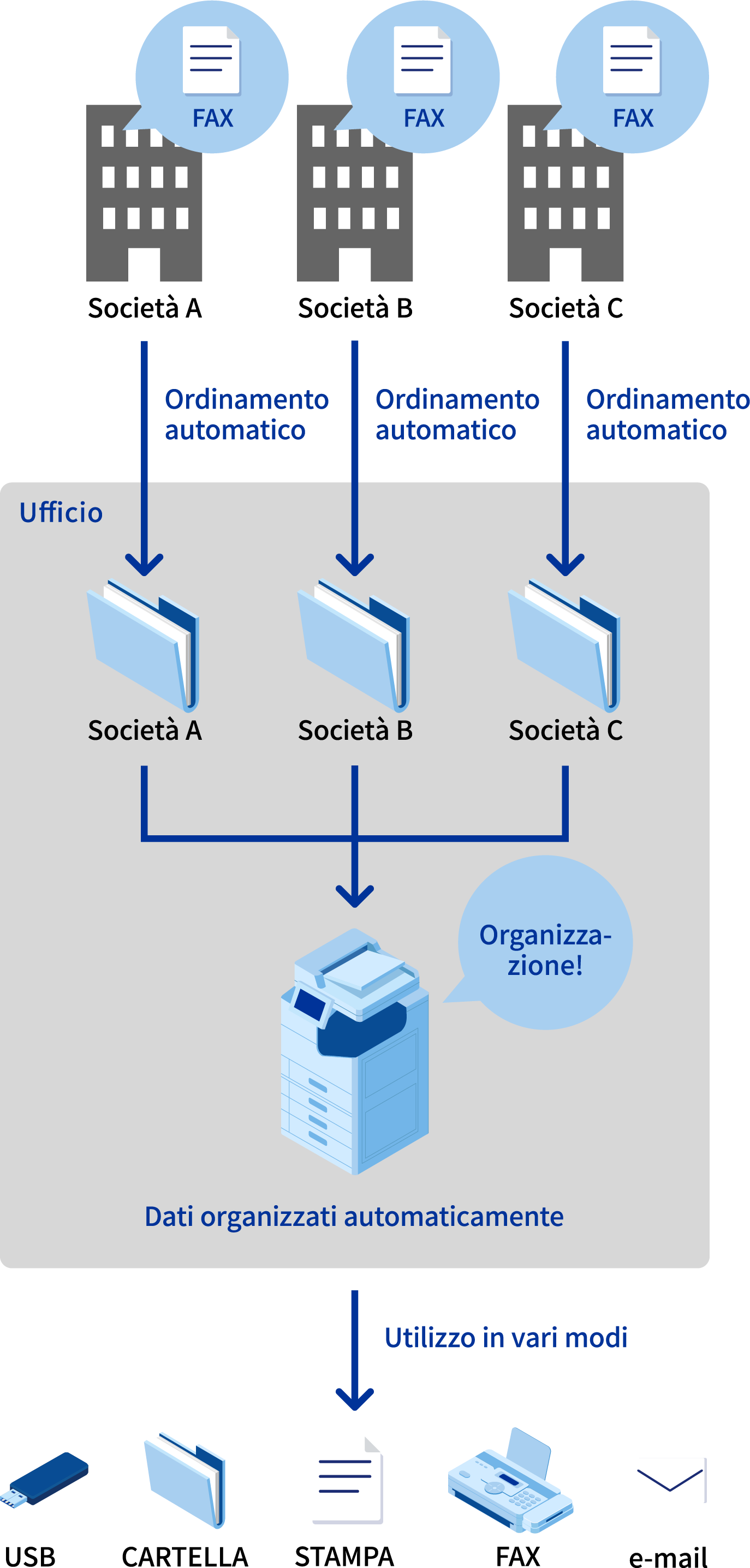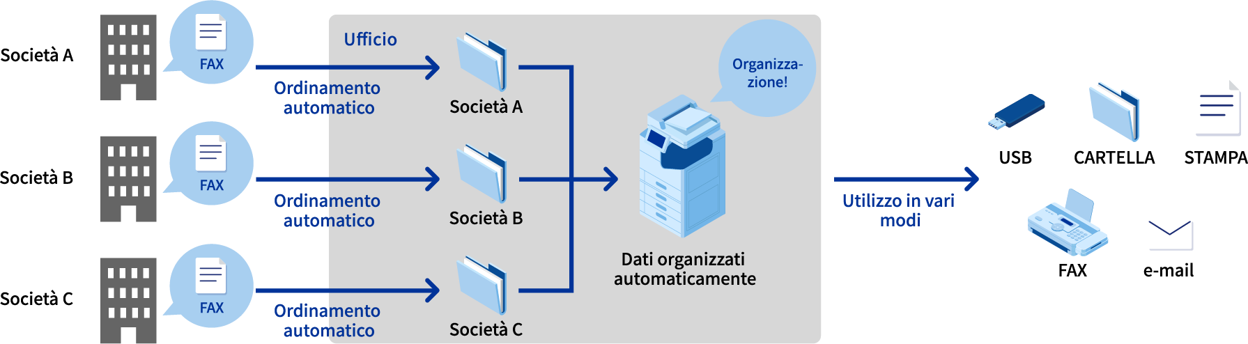 I fax ricevuti possono essere salvati automaticamente nella casella fax del dispositivo, in una cartella designata, su cloud o su memoria USB, oppure possono essere inviati tramite e-mail secondo criteri quali l'origine, la linea o l'ora di ricezione. Sono disponibili anteprime dei dati salvati che consentono agli utenti di scegliere solo gli elementi necessari.