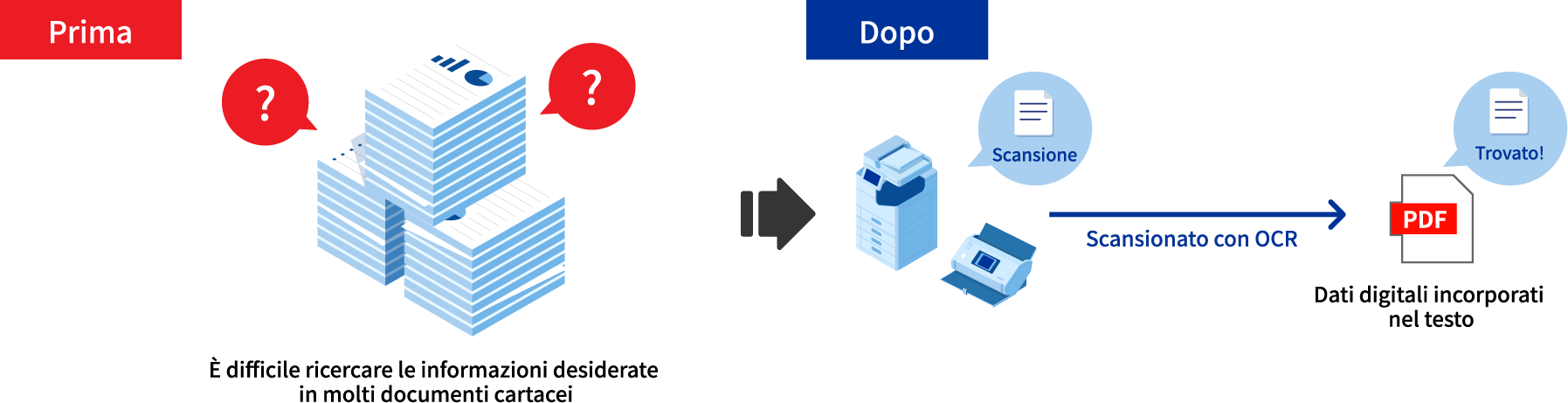 Quando viene utilizzata insieme alla funzione OCR, l'applicazione scanner "Document Capture Pro" consente di convertire i dati scansionati in un PDF con testo incorporato, facilitando la ricerca delle informazioni desiderate. Sui prodotti della serie AM, la funzione OCR è disponibile in modalità stand-alone.