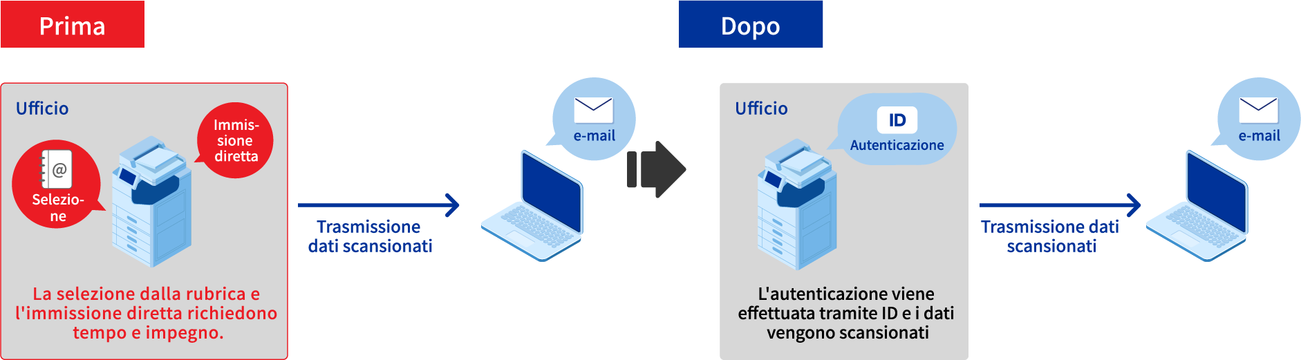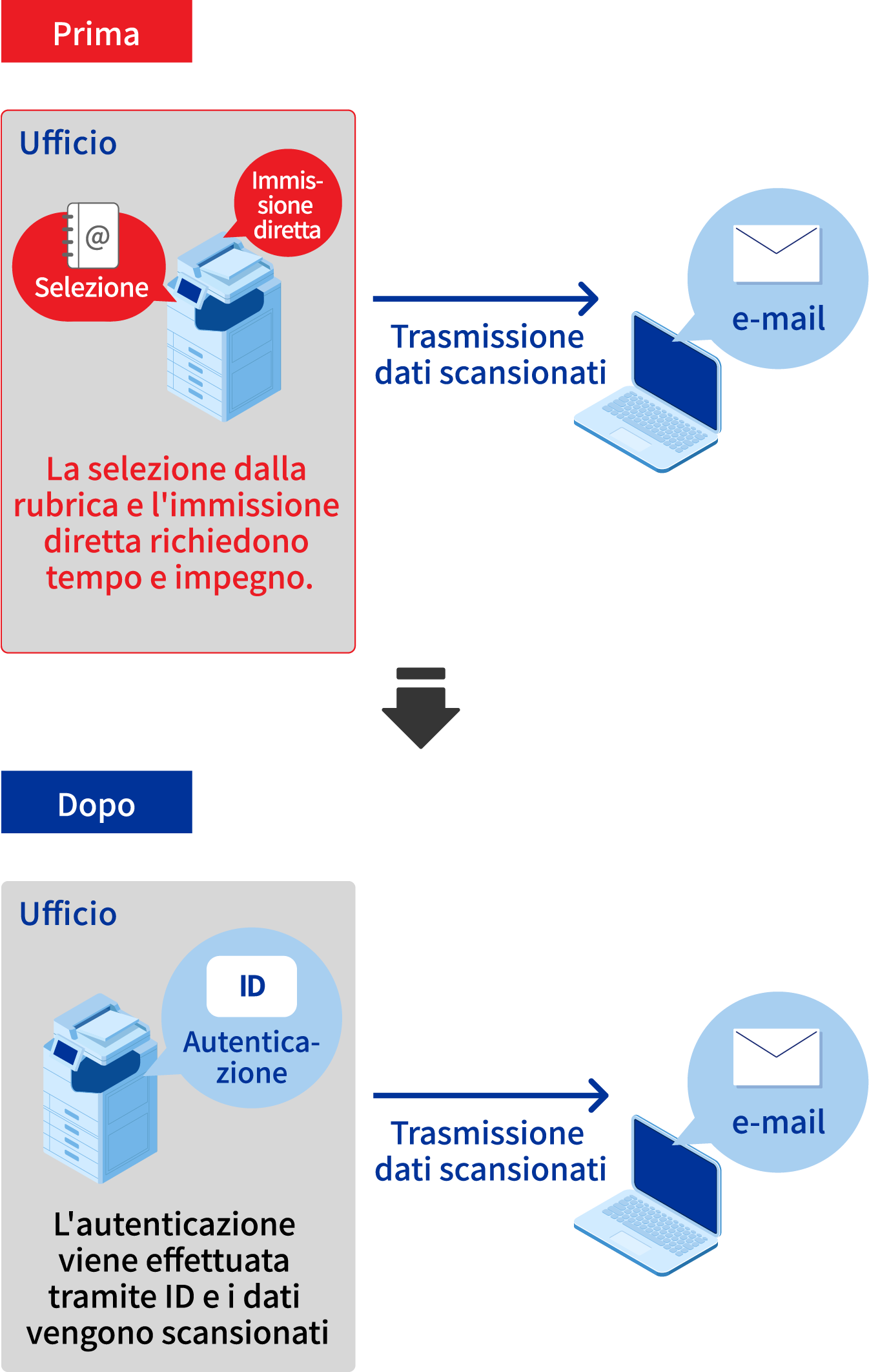 Con la funzione "Scansione a e-mail personale" nell'opzione di stampa con autenticazione "Epson Print Admin", è possibile inviare i dati scansionati al proprio indirizzo e-mail senza doverlo digitare. L'unico requisito è una scheda ID per l'autenticazione.