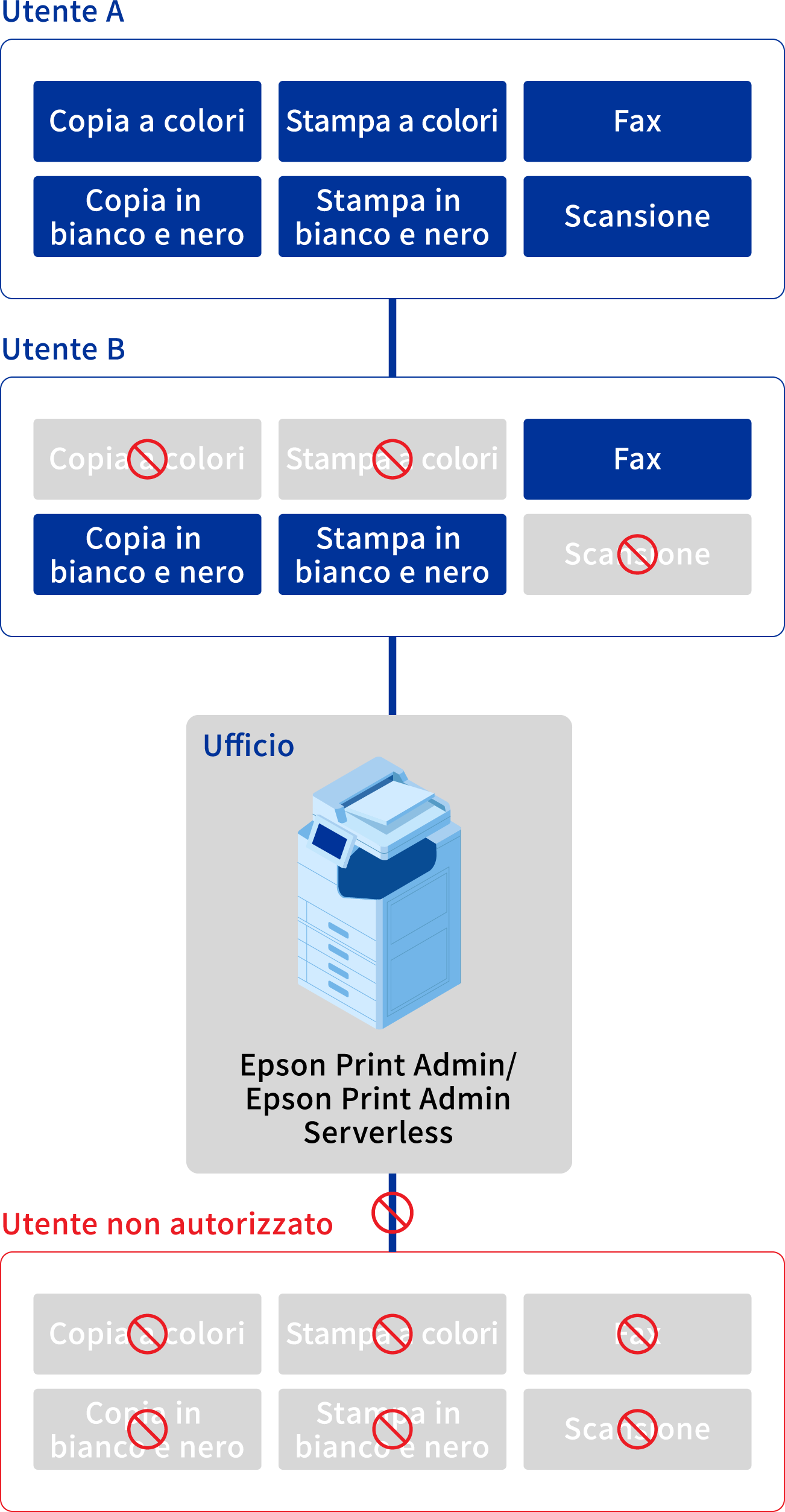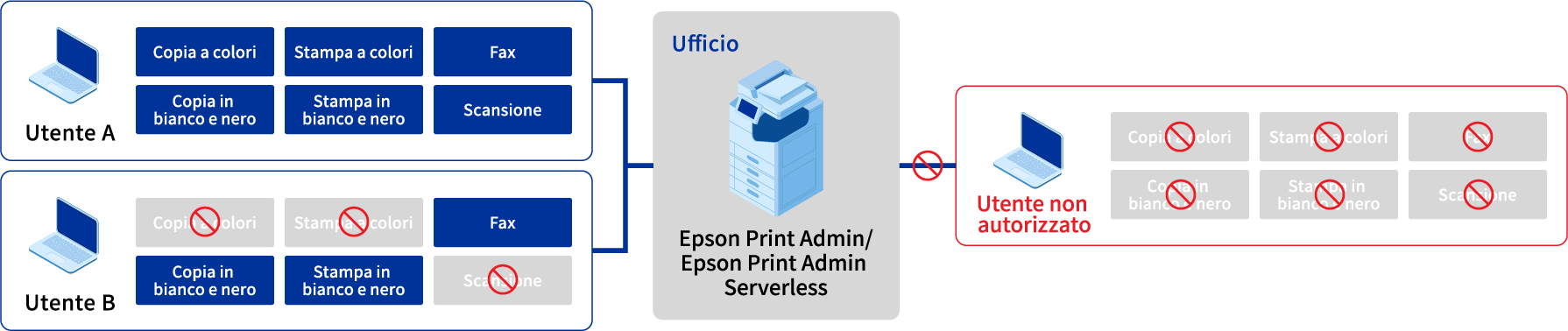 L'opzione di stampa con autenticazione "Epson Print Admin" consente agli amministratori IT di configurare le funzioni della stampante multifunzione che possono essere utilizzate da ciascun utente. Ciò impedisce agli utenti non autorizzati di utilizzare la stampante multifunzione, riducendo il rischio di fughe di informazioni.