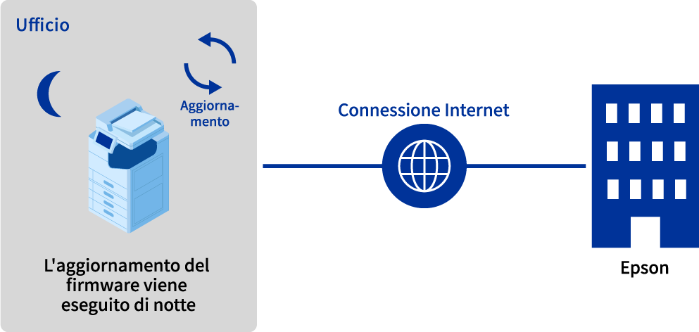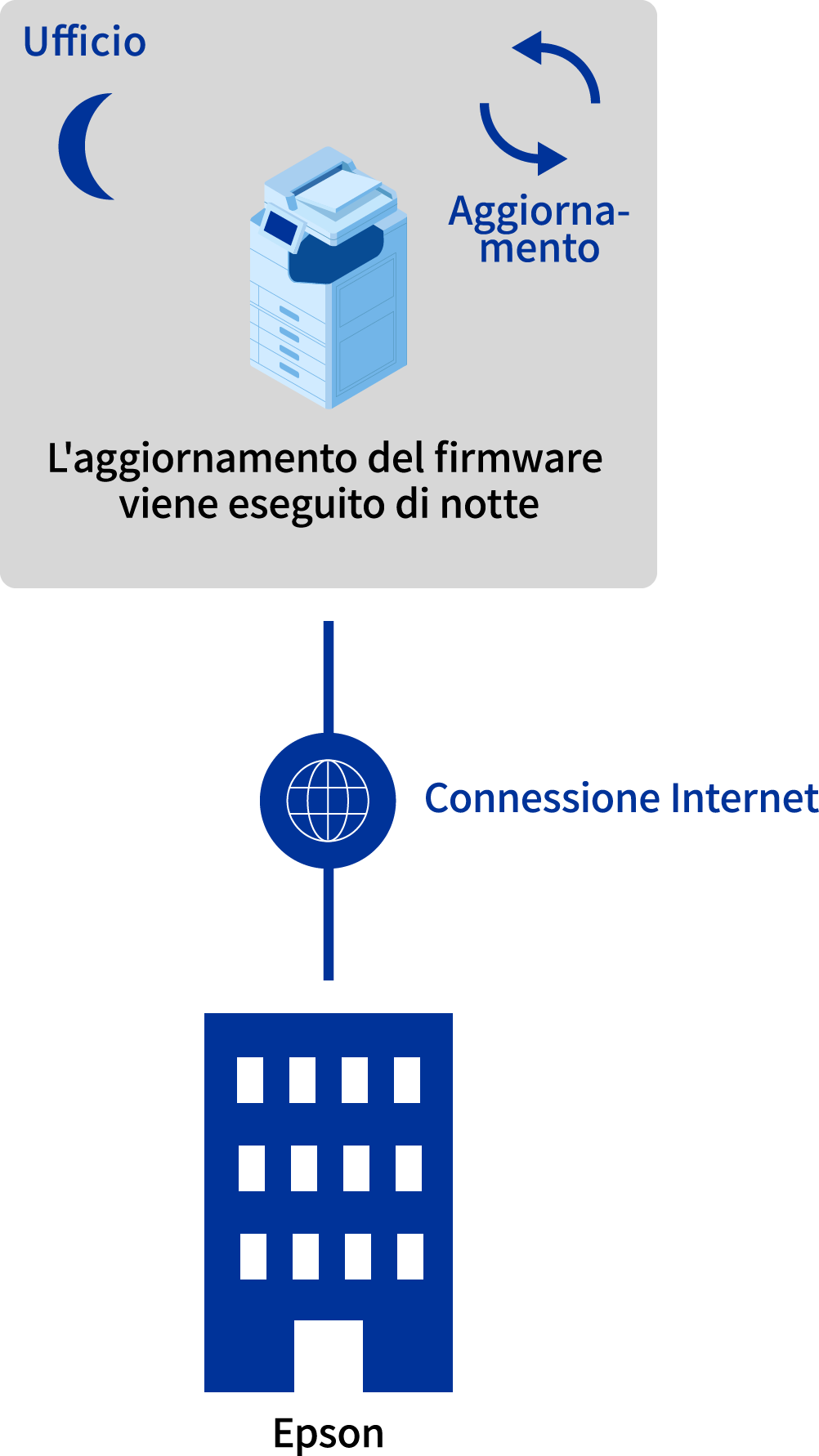 L'aggiornamento del firmware migliora la sicurezza e la facilità d'uso. Le stampanti multifunzione Epson consentono di designare un giorno e un'ora comodi per aggiornare automaticamente il firmware senza interferire con il lavoro. In questo modo, le operazioni sono stabili e non occorre preoccuparsi dei tempi di inattività delle apparecchiature.