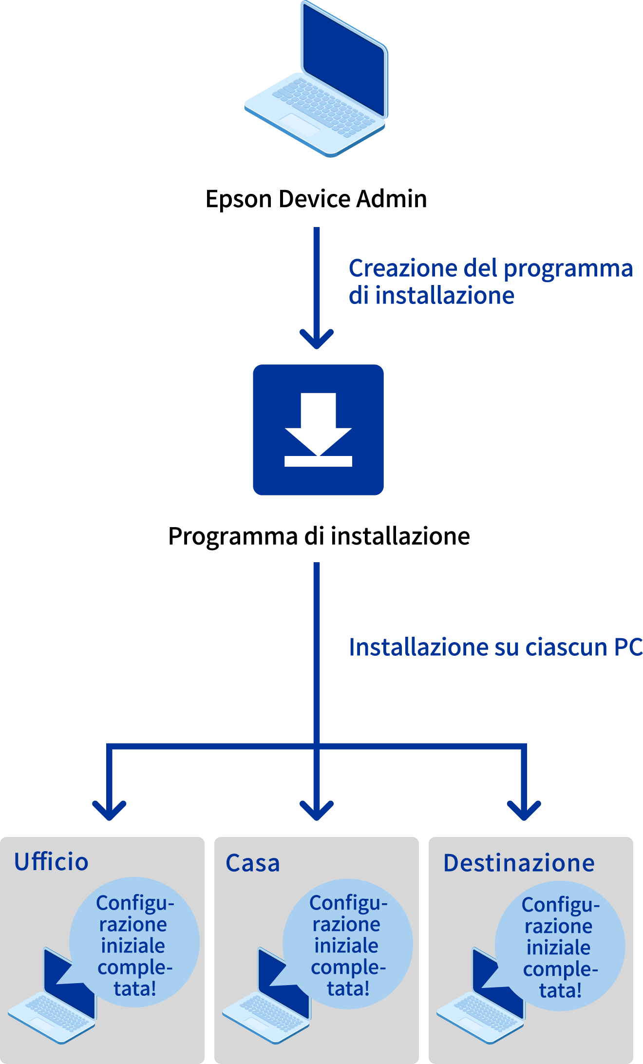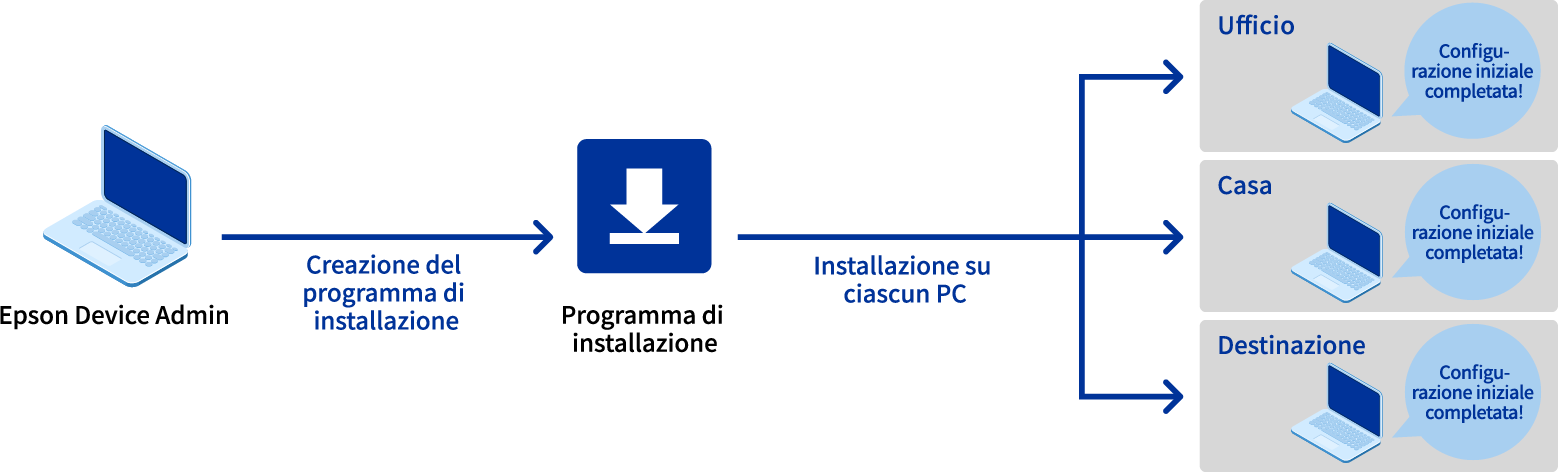 Utilizzando lo strumento di installazione assistita dei driver della stampante "EpsonNet SetupManager", puoi creare e condividere un programma di installazione per configurare facilmente le impostazioni iniziali, come IP e impostazioni fronte-retro predefinite, per rispettare le regole del tuo ambiente di lavoro, semplificando la configurazione iniziale.