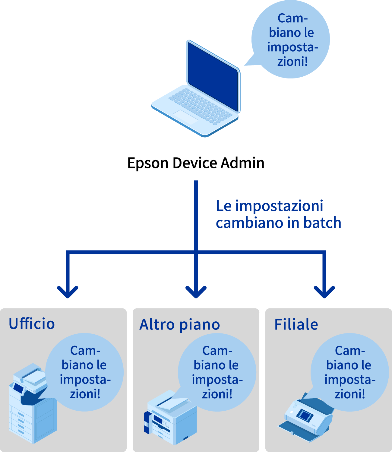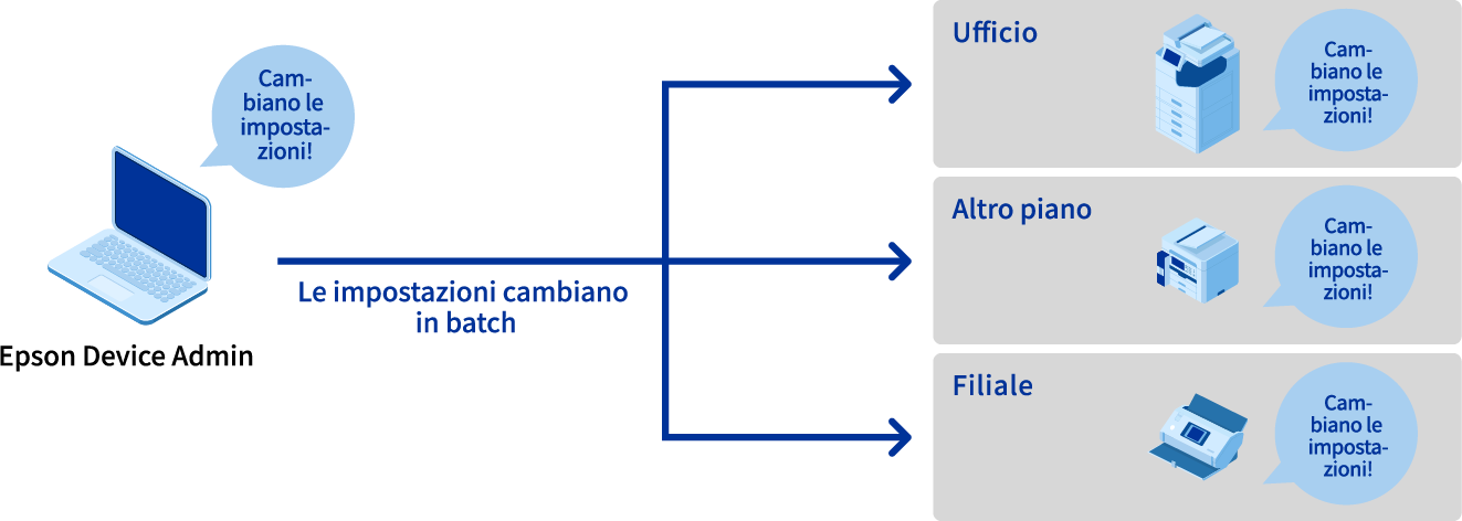 "Epson Device Admin" consente di configurare i dispositivi in gruppo tramite operazioni remote in rete. In questo modo, è facile migrare le rubriche e le informazioni sui dispositivi dalle periferiche di origine.