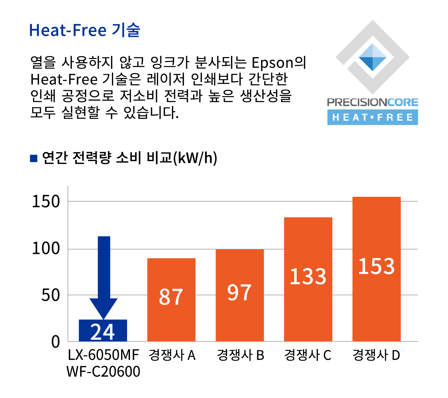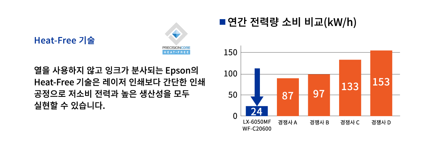 Epson의 독자적 잉크젯 기술은 인쇄 과정에서 열을 사용하지 않아 레이저 프린터에 비해 전력 소비를 크게 줄일 수 있습니다. 전력 소비가 감소는 CO2 배출량 감소로 이어지며, 레이저 프린터에서 잉크젯 프린터로 전환하면 환경에 미치는 영향도 줄일 수 있습니다.