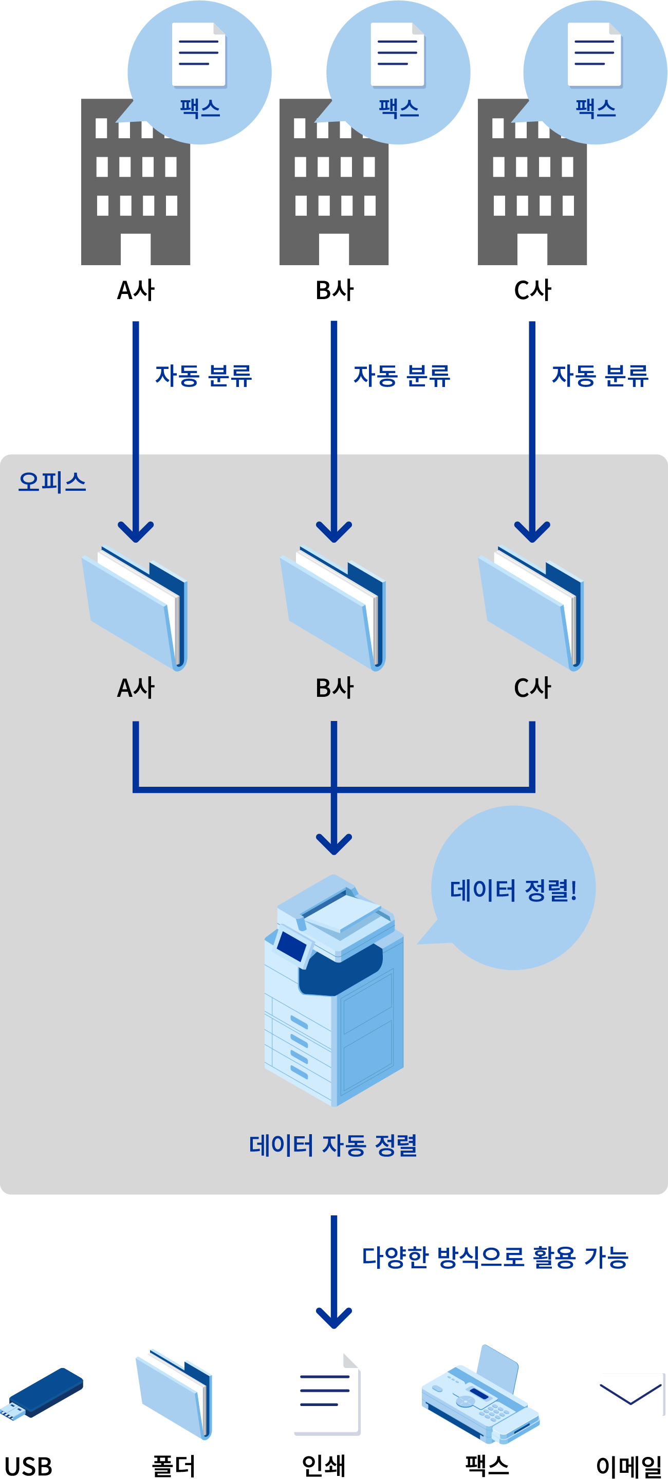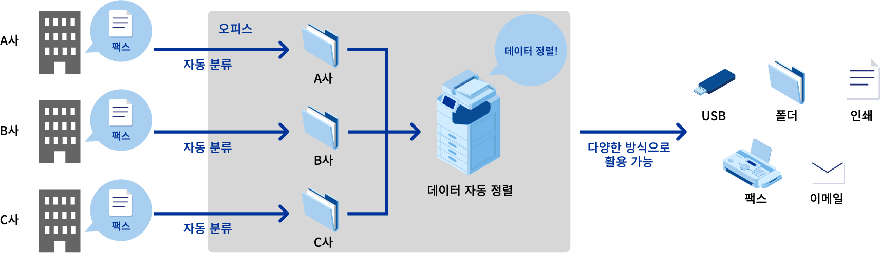 수신한 팩스 데이터는 기기 본체의 팩스함, 지정한 폴더, 클라우드, USB 메모리에 자동으로 저장하거나, 발신지, 수신 회선, 수신 시간 등을 기준으로 이메일로 전송할 수 있습니다.