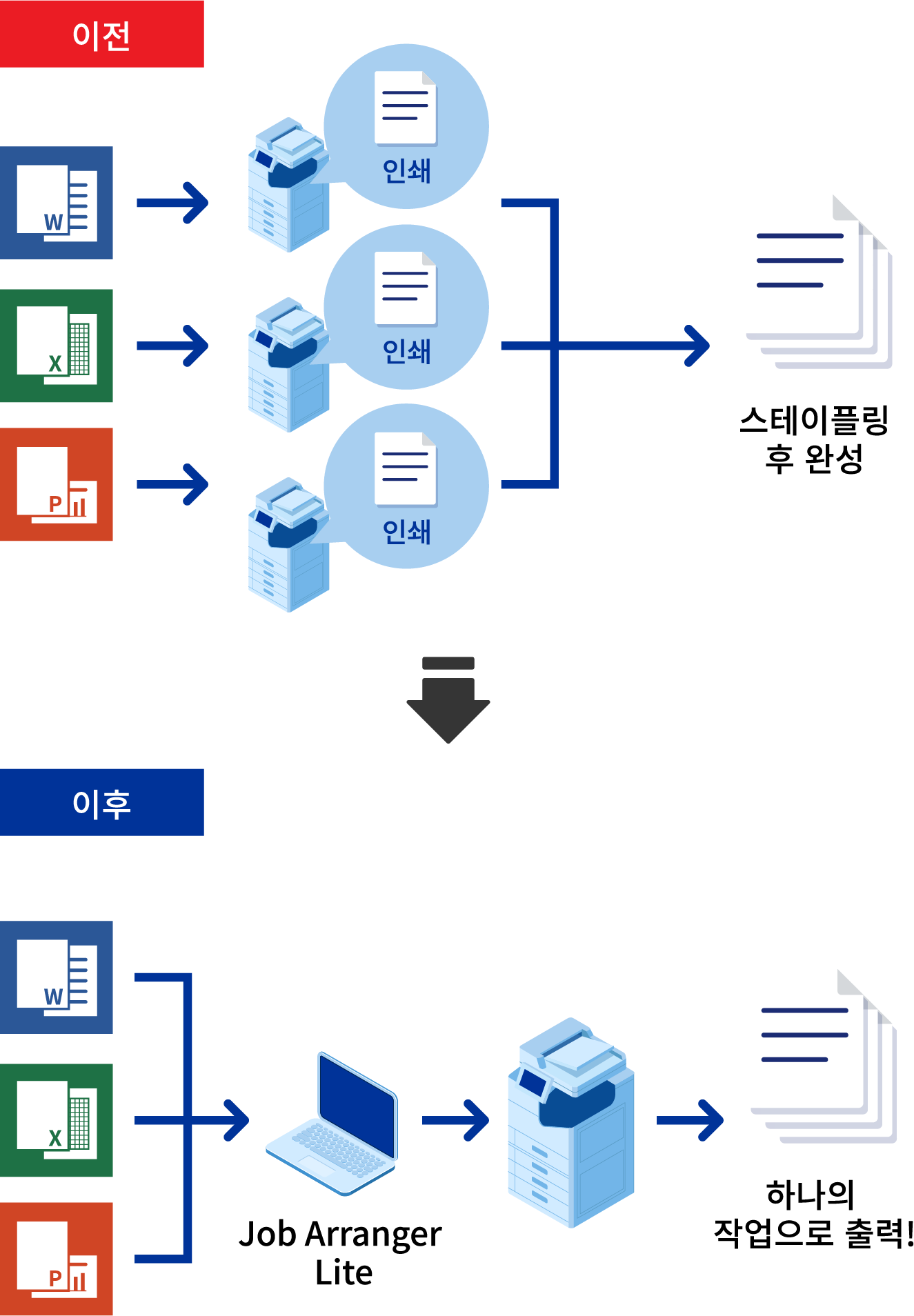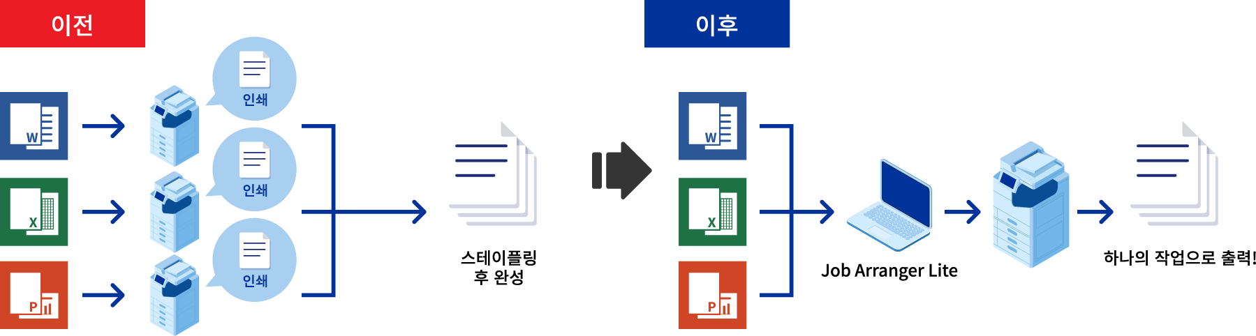 “Job Arranger Lite”를 사용하면 Word®, Excel® 또는 PowerPoint®와 같은 다양한 애플리케이션의 파일을 결합하여 일괄적으로 인쇄할 수 있습니다. 인쇄 순서, 양면 인쇄, 인쇄 설정, 페이지 할당 등의 설정을 원하는 대로 구성할 수 있습니다. 이 애플리케이션을 피니셔와 함께 사용하면 스테이플링까지 가능하므로 문서 작성의 수고를 덜어줍니다.