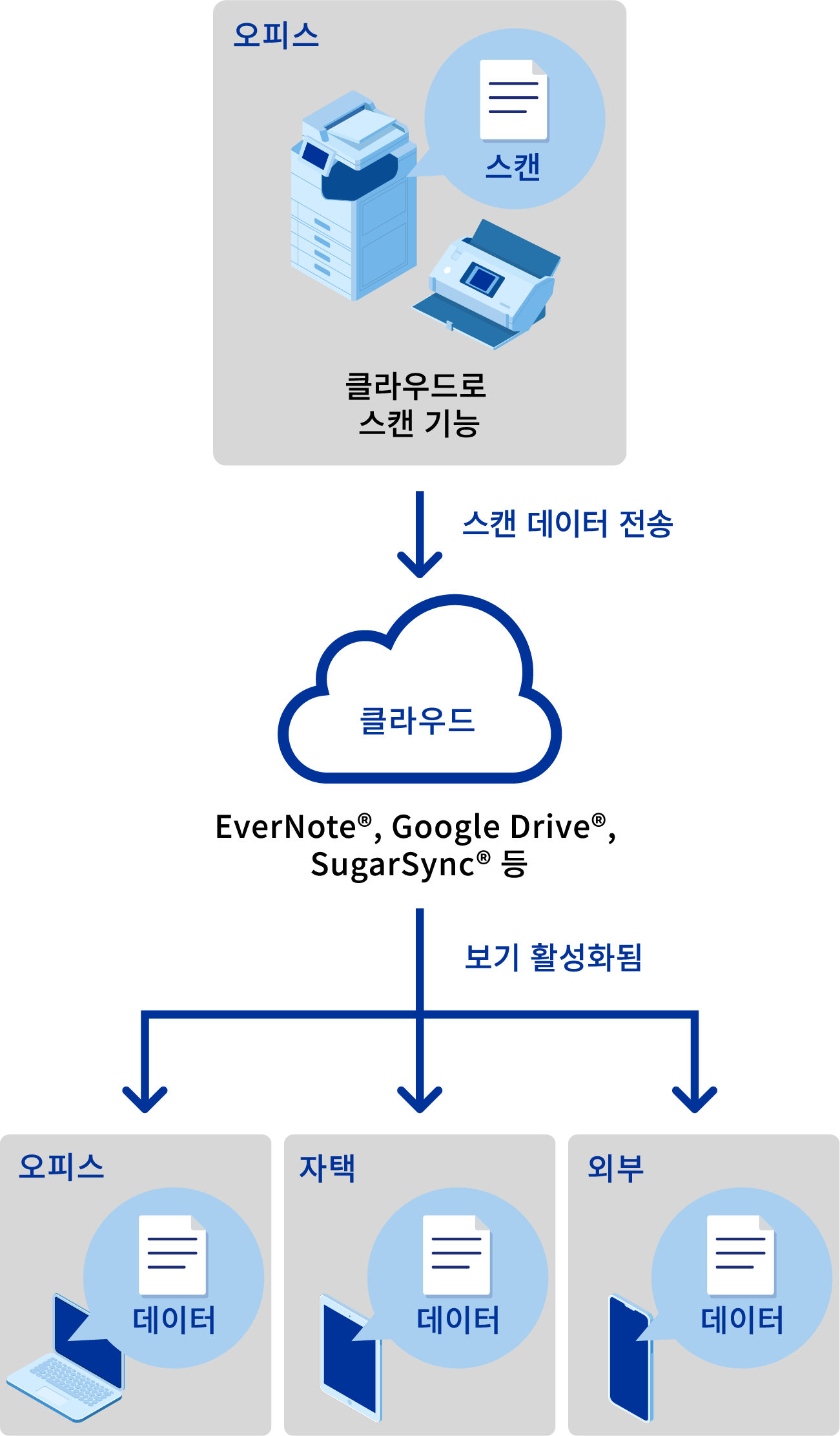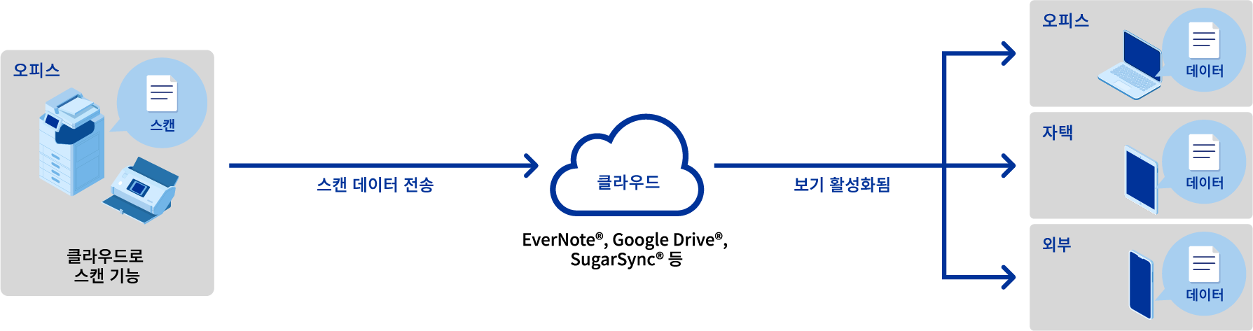 “Scan to Cloud” 기능을 사용하면 스캔 데이터를 클라우드 서비스로 전송할 수 있습니다. 스캔 후에는 인터넷을 통해 어디서나 데이터를 볼 수 있습니다.
