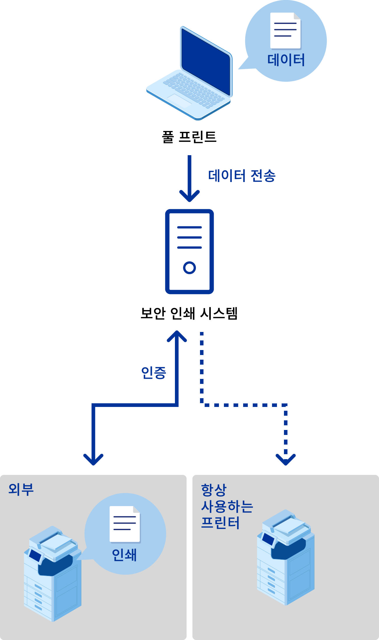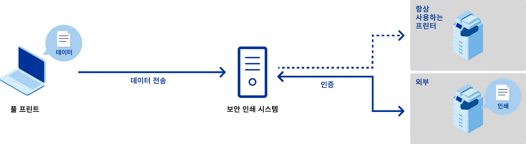 인증 인쇄 옵션 “Epson Print Admin”에서 “풀 프린트” 기능을 사용하면 동일한 인트라넷에서 작업하는 한 평소와 같은 인쇄 절차를 사용하여 인쇄할 수 있습니다. 이동 중에도 문서를 인쇄할 수 있는 기능은 이동 중 인쇄물 분실로 인한 정보 유출 위험을 줄이는 데도 도움이 됩니다.