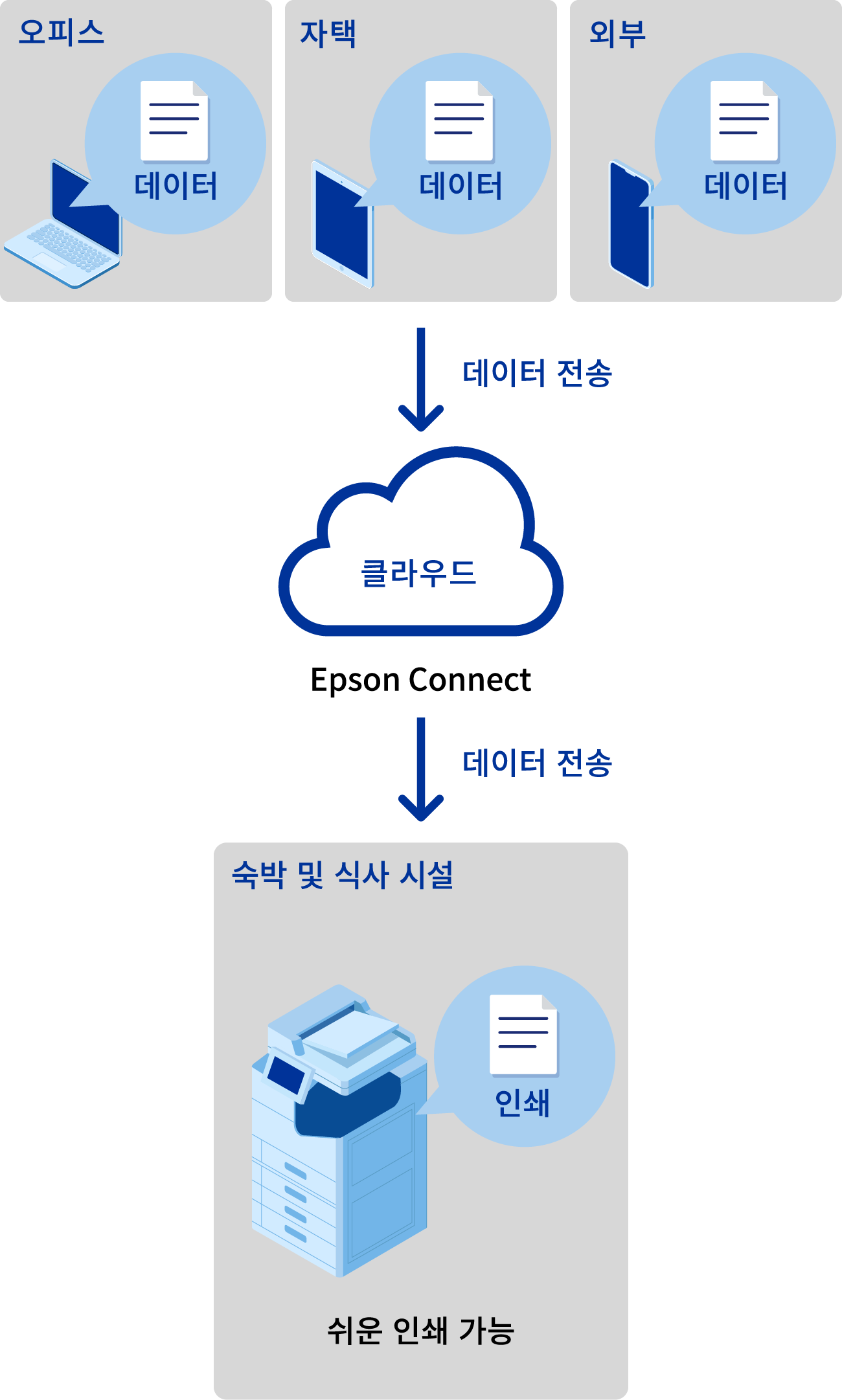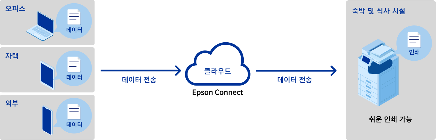 Epson Connect에 복합기를 등록하고 “이메일 인쇄”를 사용하면 이메일을 보내는 것만큼이나 쉽게 PC나 스마트폰과 같은 장치에서 인쇄할 수 있습니다. 숙박시설이나 식당 등 사람들이 모이는 장소에서 이 기능을 활용하면 고객 만족도를 높일 수 있습니다.