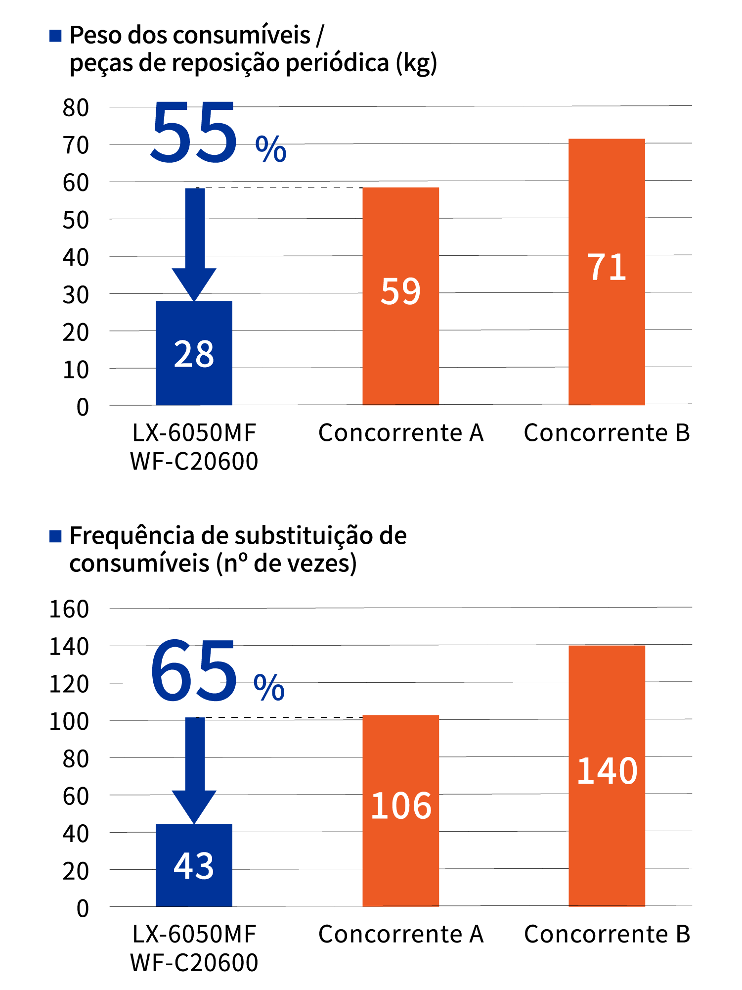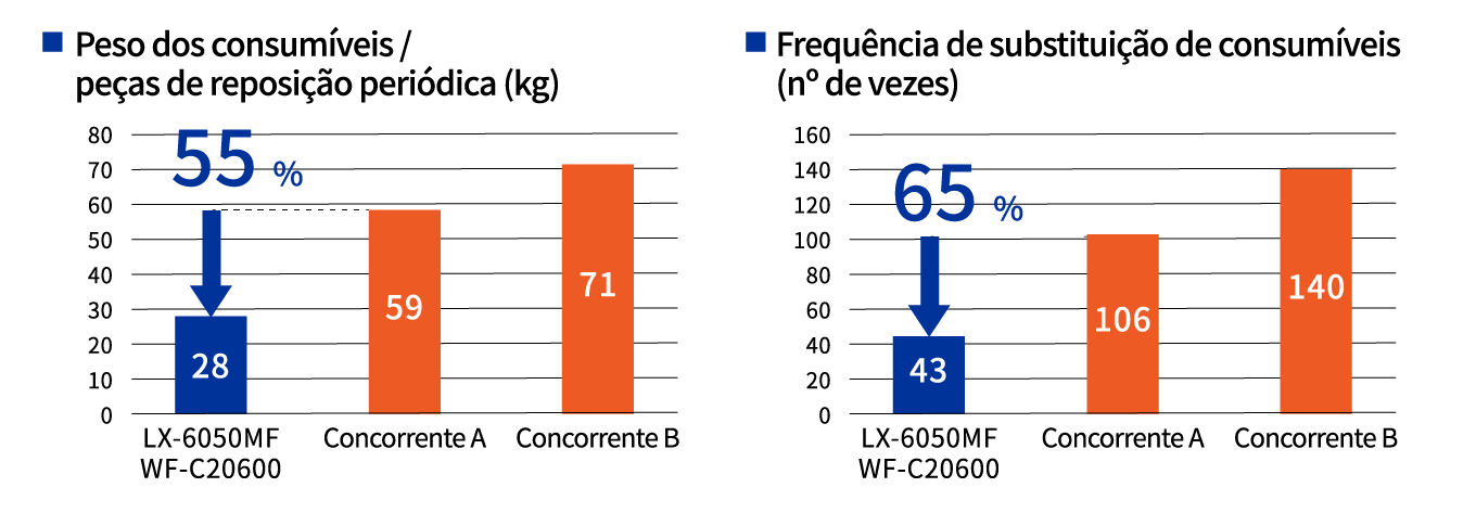 As impressoras a jato de tinta utilizam um processo de impressão simples e, diferentemente das impressoras a laser, têm poucas peças que exigem substituição regular, como fotorreceptores e unidades de fusão. As impressoras multifuncionais de escritório de tamanho A3 são usadas para imprimir volumes relativamente grandes em comparação às impressoras domésticas, portanto, os modelos a laser exigem a substituição regular de peças*, como fotorreceptores. As impressoras multifuncionais a jato de tinta têm poucas peças que precisam ser substituídas e, portanto, ajudam a reduzir o impacto ambiental por consumirem menos recursos.