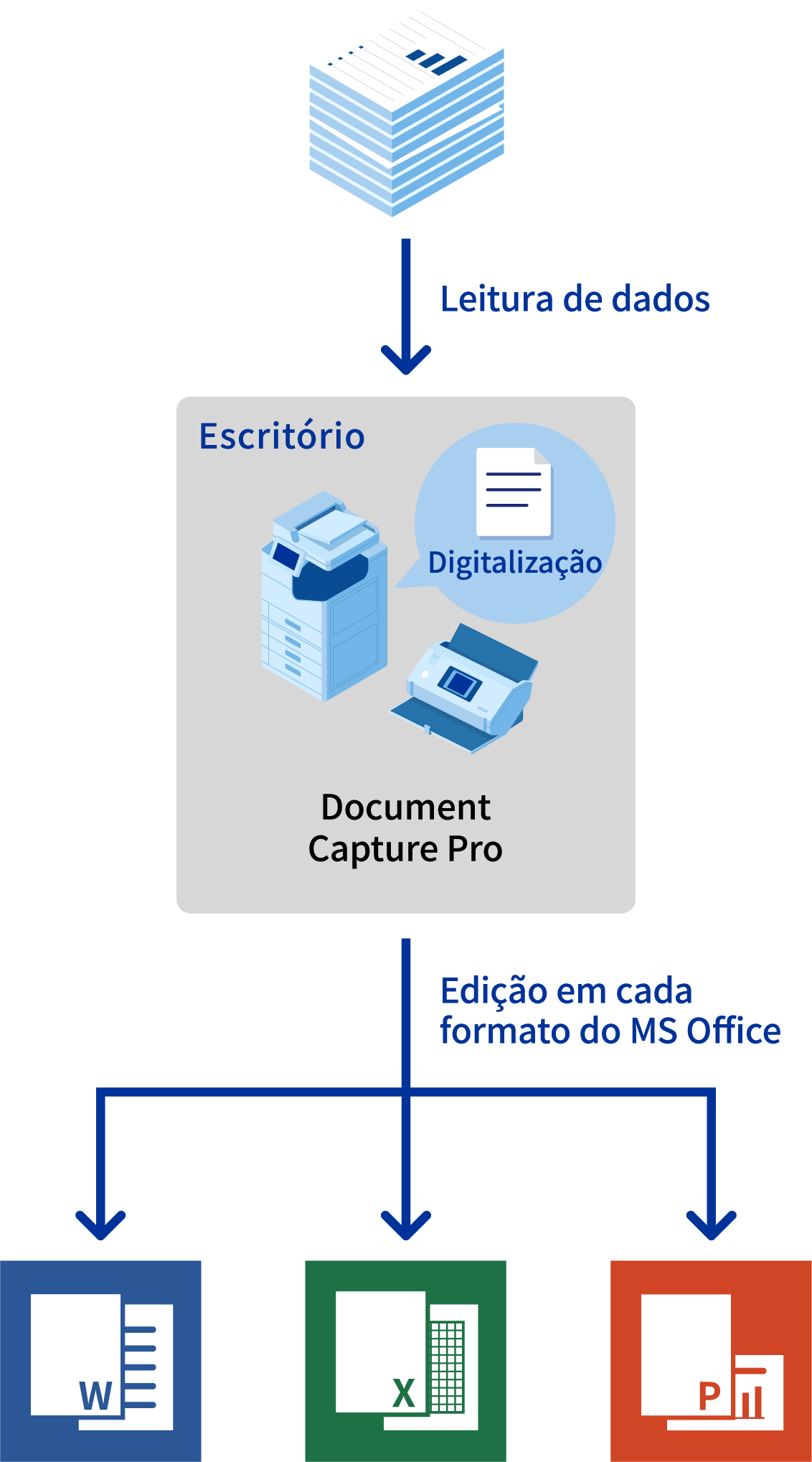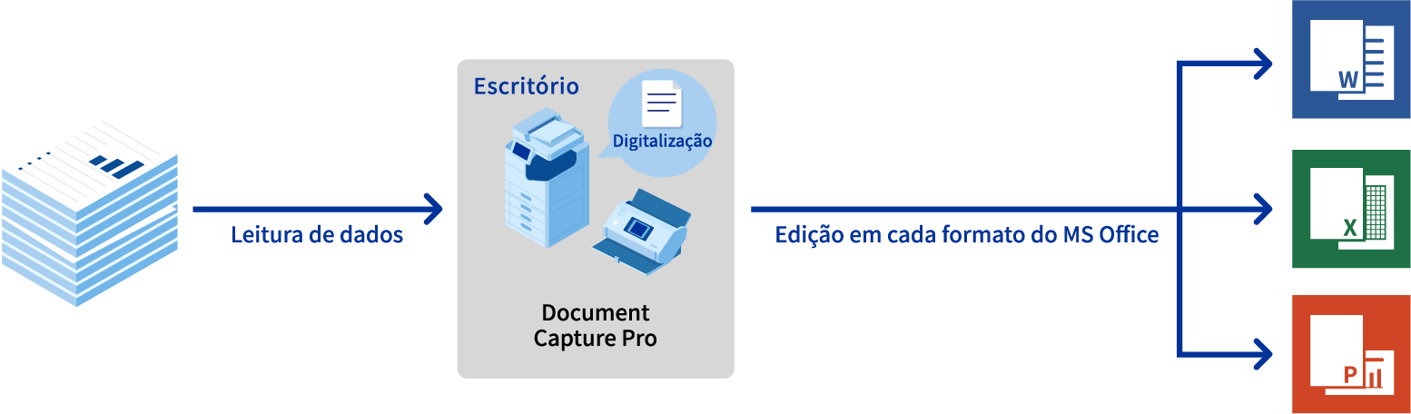 O aplicativo de scanner "Document Capture Pro Enhanced OCR" facilita a conversão de dados digitalizados em uma variedade de formatos, como arquivos Excel® e PowerPoint®. Ele converte automaticamente documentos em papel digitalizados em arquivos para uso secundário.