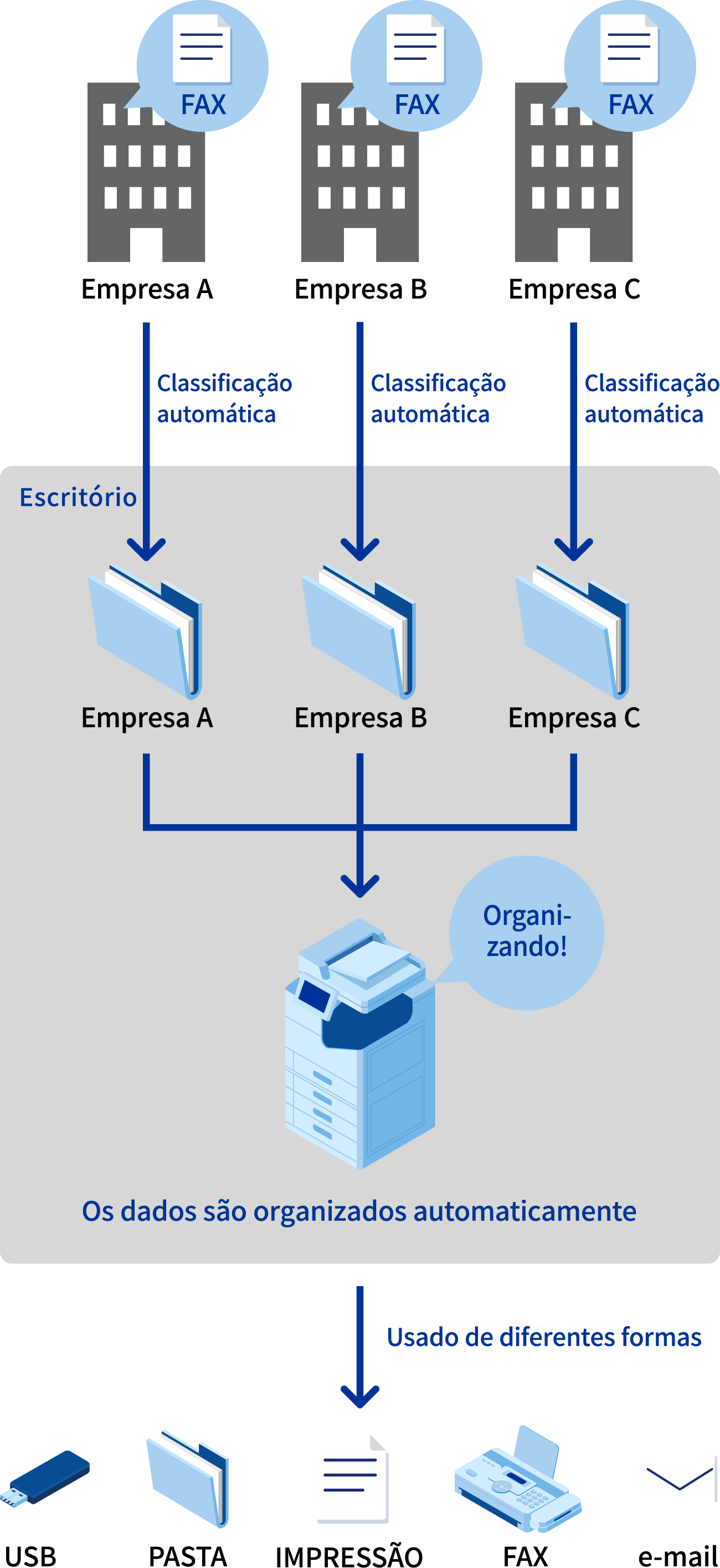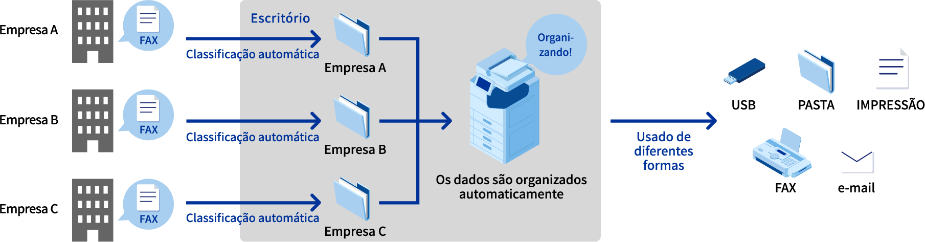 Os dados de fax recebidos podem ser salvos automaticamente na caixa de fax do próprio dispositivo, em uma pasta designada, na nuvem ou em uma memória USB, ou podem ser enviados por e-mail, com base em fatores como origem, linha de recebimento ou hora de recebimento.