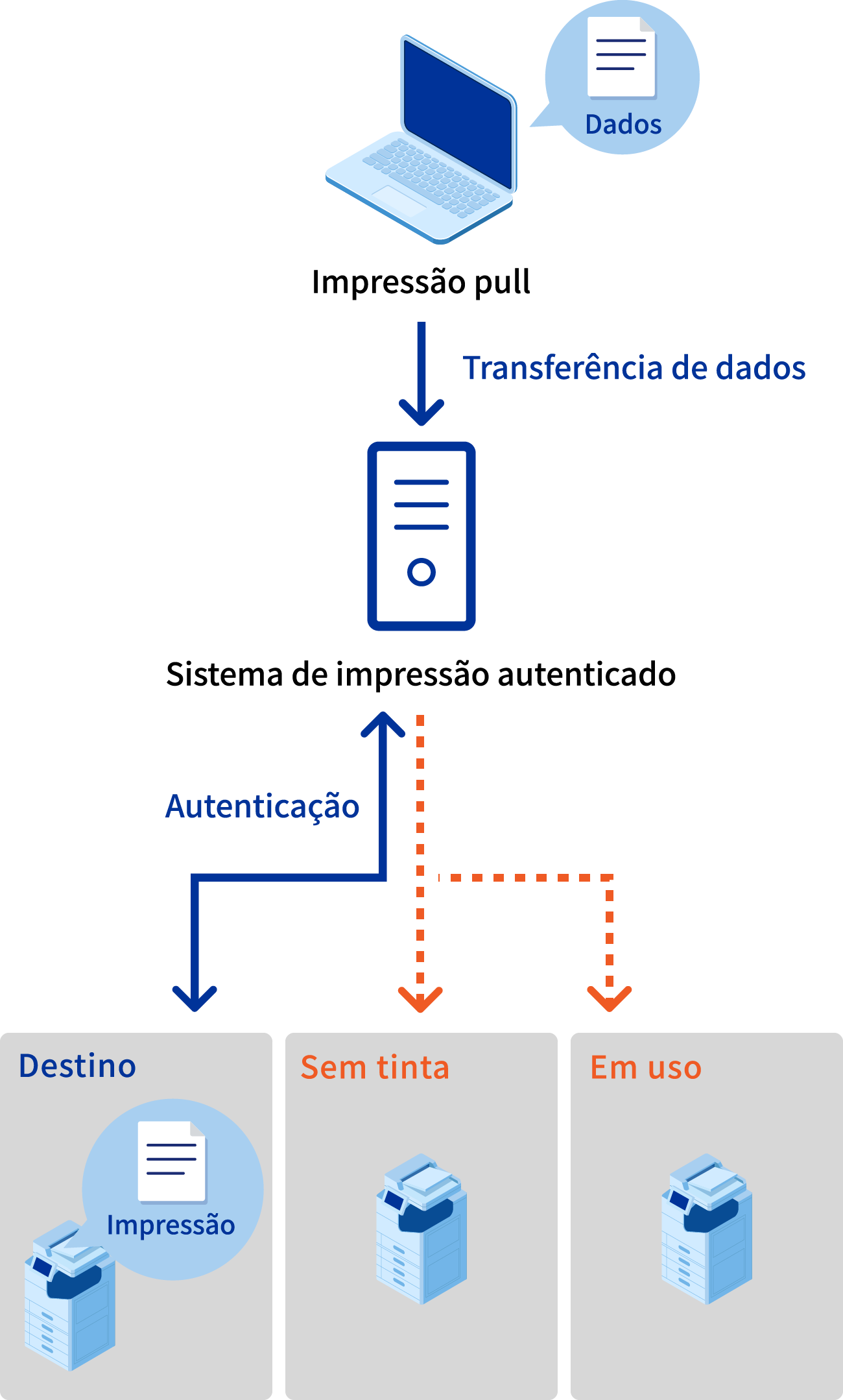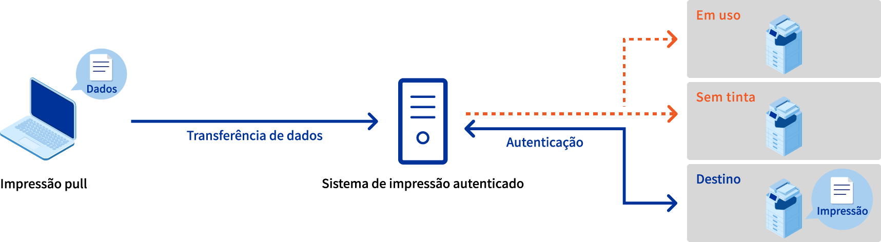 A função "Impressão pull" na opção de impressão autenticada "Epson Print Admin" permite que você imprima de uma impressora multifuncional disponível, evitando aquelas que estão em uso, sem papel ou tinta ou em manutenção.